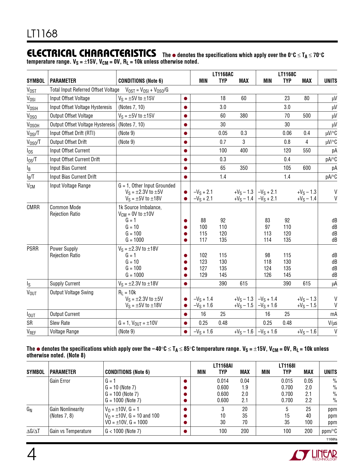 15V, VCM = 0V, RL = 10k unless otherwise noted. LT1168AC LT1168C SYMBOL PARAMETER CONDITIONS (Note 6) MIN TYP MAX MIN TYP MAX UNITS