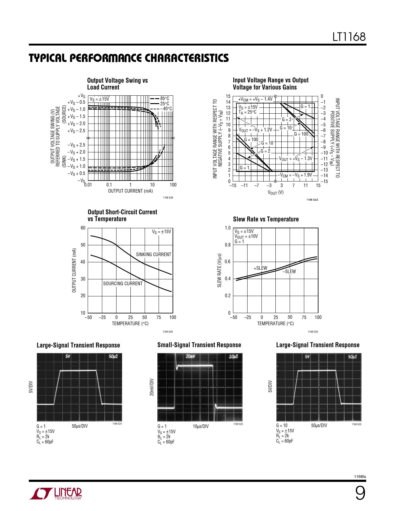 LT1168 WUTYPICAL PERFOR A CE CHARACTERISTICSOutput Voltage Swing vsInput Voltage Range vs OutputLoad CurrentVoltage for Various Gains + VS 15 0 INPUT VOLTAGE RANGE WITH RESPECT TO V +V + V S = ± 15V 85°C CM = +VS – 1.4V S – 0.5 25°C 14 –1 V G = 1 + V 13 S = ±15V –2 S – 1.0 – 40°C ) POSITIVE SUPPLY (+V IN 12 TA = 25°C –3 + VS – 1.5 11 G = 2 –4 (SOURCE) + V + V S S – 2.0 V 10 –5 G = 10 + V V S – 2.5 9 OUT = –VS + 1.2V –6 8 G = 100 –7 G = 100 7 –8 – V G = 10 S + 2.5 6 –9 – V S G = 2 S + 2.0 5 –10 – V – V 4 VOUT = +VS – 1.3V –11 IN OUTPUT VOLTAGE SWING (V) S + 1.5 ) REFERRED TO SUPPLY VOLTAGE (SINK) – V NEGATIVE SUPPLY (– 3 –12 S + 1.0 2 G = 1 –13 – VS + 0.5 –V INPUT VOLTAGE RANGE WITH RESPECT TO 1 CM = –VS + 1.9V –14 – VS 0 –15 0.01 0.1 1 10 100 –15 –11 –7 –3 3 7 11 15 OUTPUT CURRENT (mA) VOUT (V) 1168 G28 1168 G43 Output Short-Circuit Current vs TemperatureSlew Rate vs Temperature 60 1.0 VS = ±15V VS = ±15V VOUT = ±10V G = 1 50 0.8 SINKING CURRENT µs) 40 0.6 +SLEW –SLEW 30 0.4 SOURCING CURRENT SLEW RATE (V/ OUTPUT CURRENT (mA) 20 0.2 10 0 –50 –25 0 25 50 75 100 –50 –25 0 25 50 75 100 TEMPERATURE (°C) TEMPERATURE (°C) 1168 G29 1168 G30 Large-Signal Transient ResponseSmall-Signal Transient ResponseLarge-Signal Transient Response 5V/DIV 5V/DIV 20mV/DIV 1168 G31 1168 G32 G = 10 G = 1 G = 1 10µs/DIV 50µs/DIV 1168 G33 50µs/DIV V V V S = ±15V S = ±15V S = ±15V R R R L = 2k L = 2k L = 2k C C C L = 60pF L = 60pF L = 60pF 1168fa 9