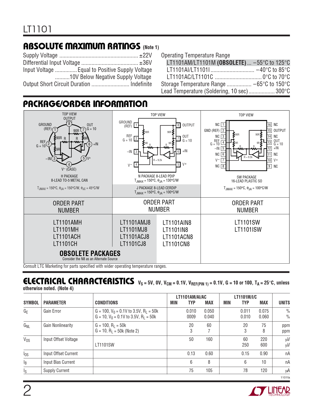 GE Gain Error G = 100, V0 = 0.1V to 3.5V, RL = 50k 0.010 0.050 0.011 0.075 % G = 10, V0 = 0.1V to 3.5V, RL = 50k 0009 0.040 0.010 0.060 % GNL Gain Nonlinearity G = 100, RL = 50k 20 60 20 75 ppm G = 10, RL = 50k (Note 2) 3 7 3 8 ppm VOS Input Offset Voltage 50 160 60 220 µV LT1101SW 250 600 µV lOS Input Offset Current 0.13 0.60 0.15 0.90 nA IB Input Bias Current 6 8 6 10 nA IS Supply Current 75 105 78 120 µA 1101fa 2