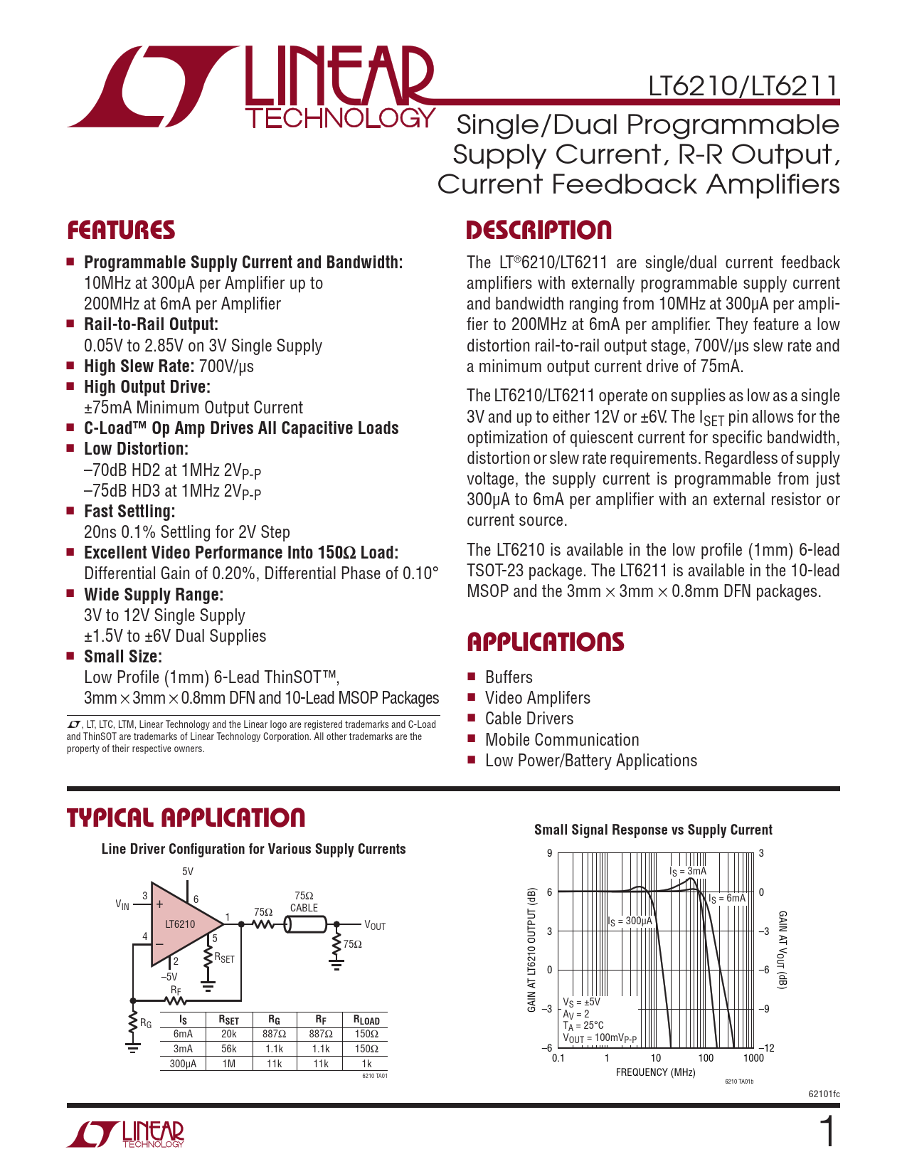 Datasheet LT6210, LT6211 Analog Devices