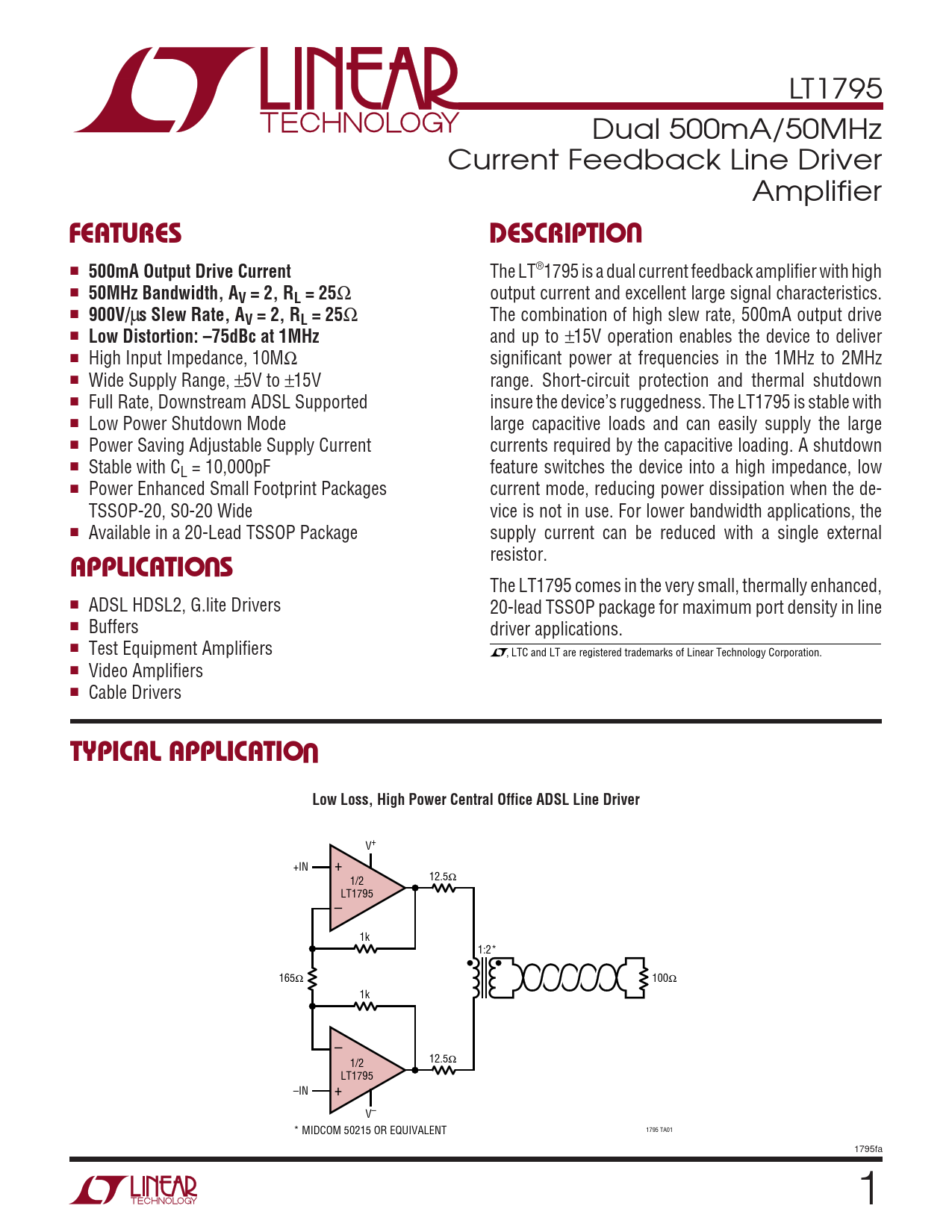 The LT1795 comes in the very small, thermally enhanced, ■ ADSL HDSL2, G.lite Drivers 20-lead TSSOP package for maximum port density in line ■ Buffers driver applications. ■ Test Equipment Amplifiers , LTC and LT are registered trademarks of Linear Technology Corporation. ■ Video Amplifiers ■ Cable Drivers