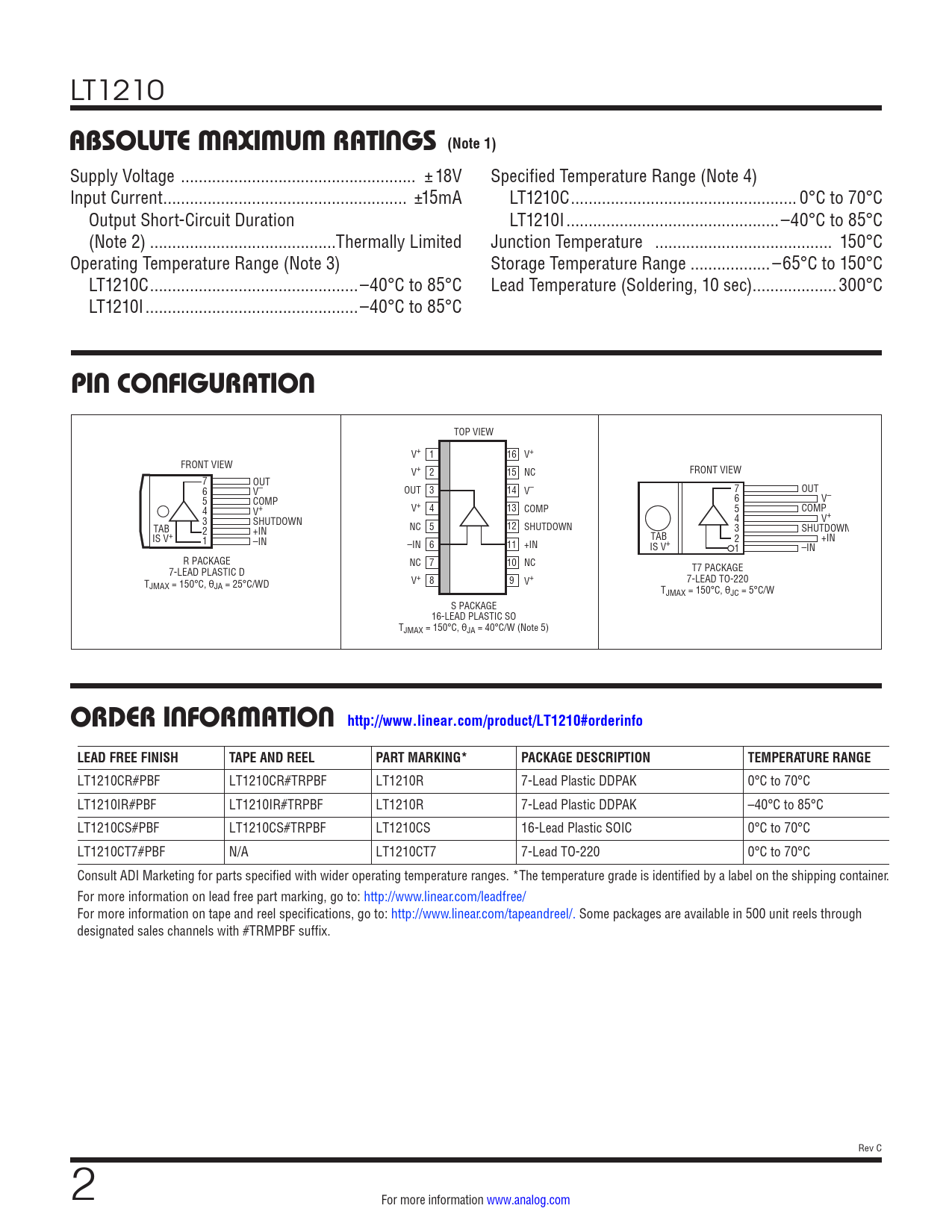 LT1210 ABSOLUTE MAXIMUM RATINGS (Note 1) Supply Voltage ... ±18V Specified Temperature Range (Note 4) Input Current ... ±15mA LT1210C ... 0°C to 70°C Output Short-Circuit Duration LT1210I ..–40°C to 85°C (Note 2) ..Thermally Limited Junction Temperature .. 150°C Operating Temperature Range (Note 3) Storage Temperature Range ..–65°C to 150°C LT1210C ...–40°C to 85°C Lead Temperature (Soldering, 10 sec) ...300°C LT1210I ..–40°C to 85°C PIN CONFIGURATION TOP VIEW V+ 1 16 V+ FRONT VIEW V+ 2 15 NC FRONT VIEW 7 OUT 6 V– OUT 3 14 V– 7 OUT 5 COMP 6 V– 4 V+ V+ 4 13 COMP 5 COMP 3 SHUTDOWN 4 V+ TAB 2 +IN NC 5 12 SHUTDOWN 3 SHUTDOWN IS V+ 1 –IN TAB 2 +IN –IN 6 11 +IN IS V+ 1 –IN R PACKAGE NC 7 10 NC 7-LEAD PLASTIC D T7 PACKAGE T V+ 8 9 V+ 7-LEAD TO-220 JMAX = 150°C, θJA = 25°C/WD TJMAX = 150°C, θJC = 5°C/W S PACKAGE 16-LEAD PLASTIC SO TJMAX = 150°C, θJA = 40°C/W (Note 5) ORDER INFORMATION http://www.linear.com/product/LT1210#orderinfoLEAD FREE FINISHTAPE AND REELPART MARKING*PACKAGE DESCRIPTIONTEMPERATURE RANGE LT1210CR#PBF LT1210CR#TRPBF LT1210R 7-Lead Plastic DDPAK 0°C to 70°C LT1210IR#PBF LT1210IR#TRPBF LT1210R 7-Lead Plastic DDPAK –40°C to 85°C LT1210CS#PBF LT1210CS#TRPBF LT1210CS 16-Lead Plastic SOIC 0°C to 70°C LT1210CT7#PBF N/A LT1210CT7 7-Lead TO-220 0°C to 70°C Consult ADI Marketing for parts specified with wider operating temperature ranges. *The temperature grade is identified by a label on the shipping container. For more information on lead free part marking, go to: http://www.linear.com/leadfree/ For more information on tape and reel specifications, go to: http://www.linear.com/tapeandreel/. Some packages are available in 500 unit reels through designated sales channels with #TRMPBF suffix. Rev C 2 For more information www.analog.com Document Outline Features Applications Typical Application Description Absolute Maximum Ratings Pin Configuration Order Information Electrical Characteristics Small-Signal Bandwidth Typical Performance Characteristics Applications Information Typical Applications Simplified Schematic Package Description Revision History Typical Application Related Parts