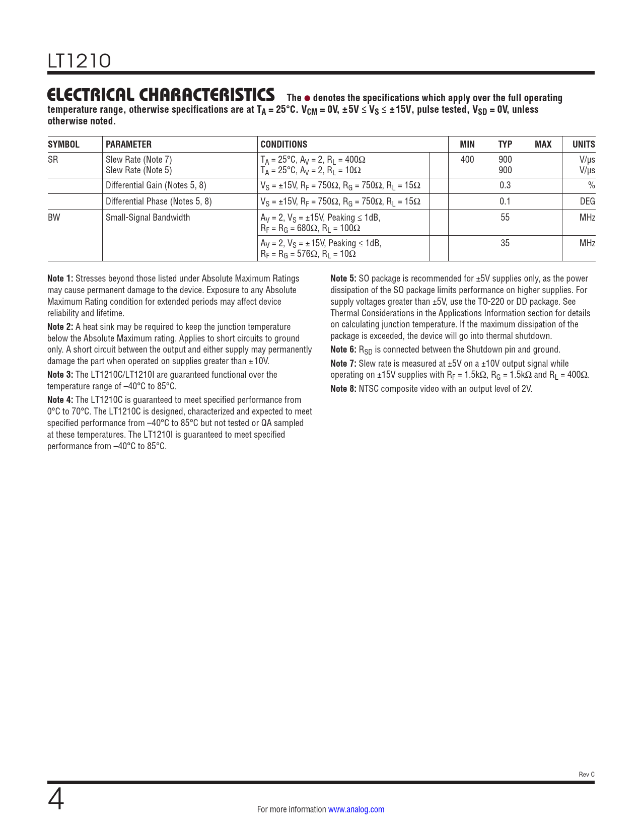 The LT1210C is guaranteed to meet specified performance from 0°C to 70°C. The LT1210C is designed, characterized and expected to meet specified performance from –40°C to 85°C but not tested or QA sampled at these temperatures. The LT1210I is guaranteed to meet specified performance from –40°C to 85°C. Rev C 4 For more information www.analog.com Document Outline Features Applications Typical Application Description Absolute Maximum Ratings Pin Configuration Order Information Electrical Characteristics Small-Signal Bandwidth Typical Performance Characteristics Applications Information Typical Applications Simplified Schematic Package Description Revision History Typical Application Related Parts