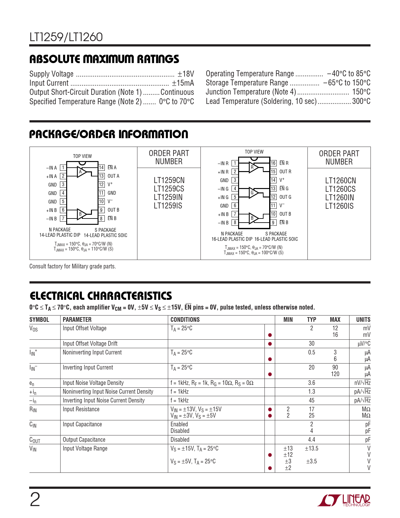 ORDER PART TOP VIEW ORDER PART TOP VIEW NUMBER –IN R 1 16 EN R NUMBER –IN A 1 14 EN A R A +IN R 2 15 OUT R +IN A 2 13 OUT A LT1259CN GND 3 14 V+ LT1260CN GND 3 12 V+ LT1259CS –IN G 4 13 EN G LT1260CS GND 4 11 GND G LT1259IN +IN G 5 12 OUT G LT1260IN GND 5 10 V– LT1259IS GND 6 11 V– LT1260IS +IN B 6 9 OUT B B +IN B 7 10 OUT B –IN B 7 8 EN B B –IN B 8 9 EN B N PACKAGE S PACKAGE N PACKAGE S PACKAGE 14-LEAD PLASTIC DIP 14-LEAD PLASTIC SOIC 16-LEAD PLASTIC DIP 16-LEAD PLASTIC SOIC TJMAX = 150°C, θJA = 70°C/W (N) TJMAX = 150°C, θJA = 70°C/W (N) TJMAX = 150°C, θJA = 110°C/W (S) TJMAX = 150°C, θJA = 100°C/W (S) Consult factory for Military grade parts.