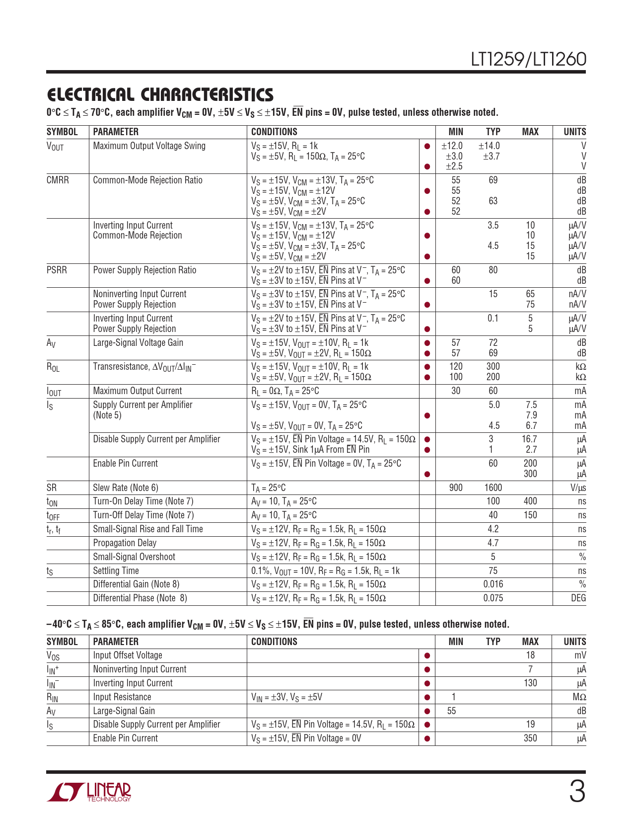 VOUT Maximum Output Voltage Swing VS = ±15V, RL = 1k ● ±12.0 ±14.0 V VS = ±5V, RL = 150Ω, TA = 25°C ±3.0 ±3.7 V ● ±2.5 V CMRR Common-Mode Rejection Ratio VS = ±15V, VCM = ±13V, TA = 25°C 55 69 dB VS = ±15V, VCM = ±12V ● 55 dB VS = ±5V, VCM = ±3V, TA = 25°C 52 63 dB VS = ±5V, VCM = ±2V ● 52 dB Inverting Input Current VS = ±15V, VCM = ±13V, TA = 25°C 3.5 10 µA/V Common-Mode Rejection VS = ±15V, VCM = ±12V ● 10 µA/V VS = ±5V, VCM = ±3V, TA = 25°C 4.5 15 µA/V VS = ±5V, VCM = ±2V ● 15 µA/V PSRR Power Supply Rejection Ratio VS = ±2V to ±15V, EN Pins at V –, TA = 25°C 60 80 dB VS = ±3V to ±15V, EN Pins at V – ● 60 dB Noninverting Input Current VS = ±3V to ±15V, EN Pins at V –, TA = 25°C 15 65 nA/V Power Supply Rejection VS = ±3V to ±15V, EN Pins at V – ● 75 nA/V Inverting Input Current VS = ±2V to ±15V, EN Pins at V –, TA = 25°C 0.1 5 µA/V Power Supply Rejection VS = ±3V to ±15V, EN Pins at V – ● 5 µA/V AV Large-Signal Voltage Gain VS = ±15V, VOUT = ±10V, RL = 1k ● 57 72 dB VS = ±5V, VOUT = ±2V, RL = 150Ω ● 57 69 dB R – OL Transresistance, ∆VOUT/∆IIN VS = ±15V, VOUT = ±10V, RL = 1k ● 120 300 kΩ VS = ±5V, VOUT = ±2V, RL = 150Ω ● 100 200 kΩ IOUT Maximum Output Current RL = 0Ω, TA = 25°C 30 60 mA IS Supply Current per Amplifier VS = ±15V, VOUT = 0V, TA = 25°C 5.0 7.5 mA (Note 5) ● 7.9 mA VS = ±5V, VOUT = 0V, TA = 25°C 4.5 6.7 mA Disable Supply Current per Amplifier VS = ±15V, EN Pin Voltage = 14.5V, RL = 150Ω ● 3 16.7 µA VS = ±15V, Sink 1µA From EN Pin ● 1 2.7 µA Enable Pin Current VS = ±15V, EN Pin Voltage = 0V, TA = 25°C 60 200 µA ● 300 µA SR Slew Rate (Note 6) TA = 25°C 900 1600 V/µs tON Turn-On Delay Time (Note 7) AV = 10, TA = 25°C 100 400 ns tOFF Turn-Off Delay Time (Note 7) AV = 10, TA = 25°C 40 150 ns tr, tf Small-Signal Rise and Fall Time VS = ±12V, RF = RG = 1.5k, RL = 150Ω 4.2 ns Propagation Delay VS = ±12V, RF = RG = 1.5k, RL = 150Ω 4.7 ns Small-Signal Overshoot VS = ±12V, RF = RG = 1.5k, RL = 150Ω 5 % tS Settling Time 0.1%, VOUT = 10V, RF = RG = 1.5k, RL = 1k 75 ns Differential Gain (Note 8) VS = ±12V, RF = RG = 1.5k, RL = 150Ω 0.016 % Differential Phase (Note 8) VS = ±12V, RF = RG = 1.5k, RL = 150Ω 0.075 DEG