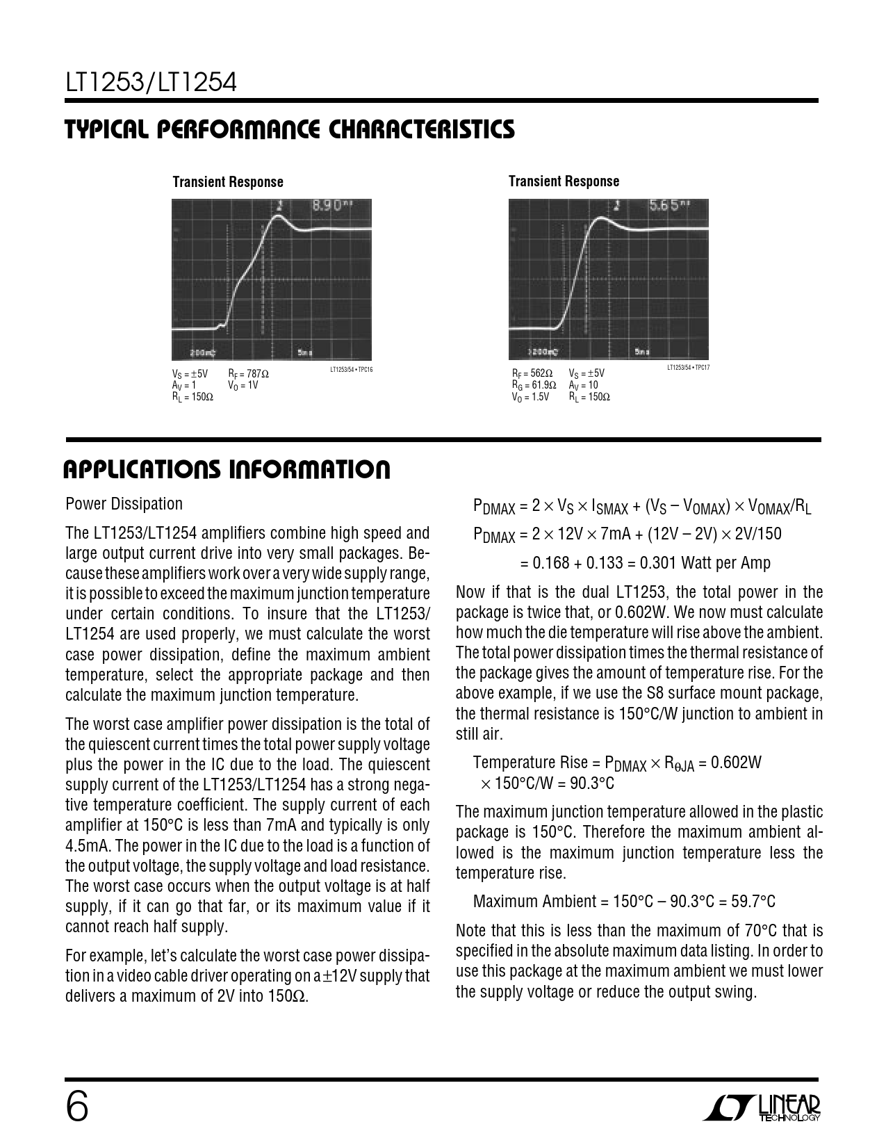 Power Dissipation PDMAX = 2 × VS × ISMAX + (VS – VOMAX) × VOMAX/RL The LT1253/LT1254 amplifiers combine high speed and PDMAX = 2 × 12V × 7mA + (12V – 2V) × 2V/150 large output current drive into very small packages. Be- = 0.168 + 0.133 = 0.301 Watt per Amp cause these amplifiers work over a very wide supply range, it is possible to exceed the maximum junction temperature Now if that is the dual LT1253, the total power in the under certain conditions. To insure that the LT1253/ package is twice that, or 0.602W. We now must calculate LT1254 are used properly, we must calculate the worst how much the die temperature will rise above the ambient. case power dissipation, define the maximum ambient The total power dissipation times the thermal resistance of temperature, select the appropriate package and then the package gives the amount of temperature rise. For the calculate the maximum junction temperature. above example, if we use the S8 surface mount package, the thermal resistance is 150°C/W junction to ambient in The worst case amplifier power dissipation is the total of still air. the quiescent current times the total power supply voltage plus the power in the IC due to the load. The quiescent Temperature Rise = PDMAX × RθJA = 0.602W supply current of the LT1253/LT1254 has a strong nega- × 150°C/W = 90.3°C tive temperature coefficient. The supply current of each The maximum junction temperature allowed in the plastic amplifier at 150°C is less than 7mA and typically is only package is 150°C. Therefore the maximum ambient al- 4.5mA. The power in the IC due to the load is a function of lowed is the maximum junction temperature less the the output voltage, the supply voltage and load resistance. temperature rise. The worst case occurs when the output voltage is at half supply, if it can go that far, or its maximum value if it Maximum Ambient = 150°C – 90.3°C = 59.7°C cannot reach half supply. Note that this is less than the maximum of 70°C that is For example, let’s calculate the worst case power dissipa- specified in the absolute maximum data listing. In order to tion in a video cable driver operating on a ±12V supply that use this package at the maximum ambient we must lower delivers a maximum of 2V into 150Ω. the supply voltage or reduce the output swing. 6