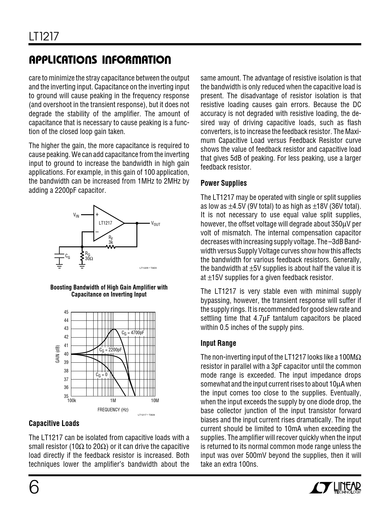 APPLICATI. S I FOR ATIO. Power Supplies. Boosting Bandwidth of High Gain Amplifier with. Capacitance on Inverting Input
