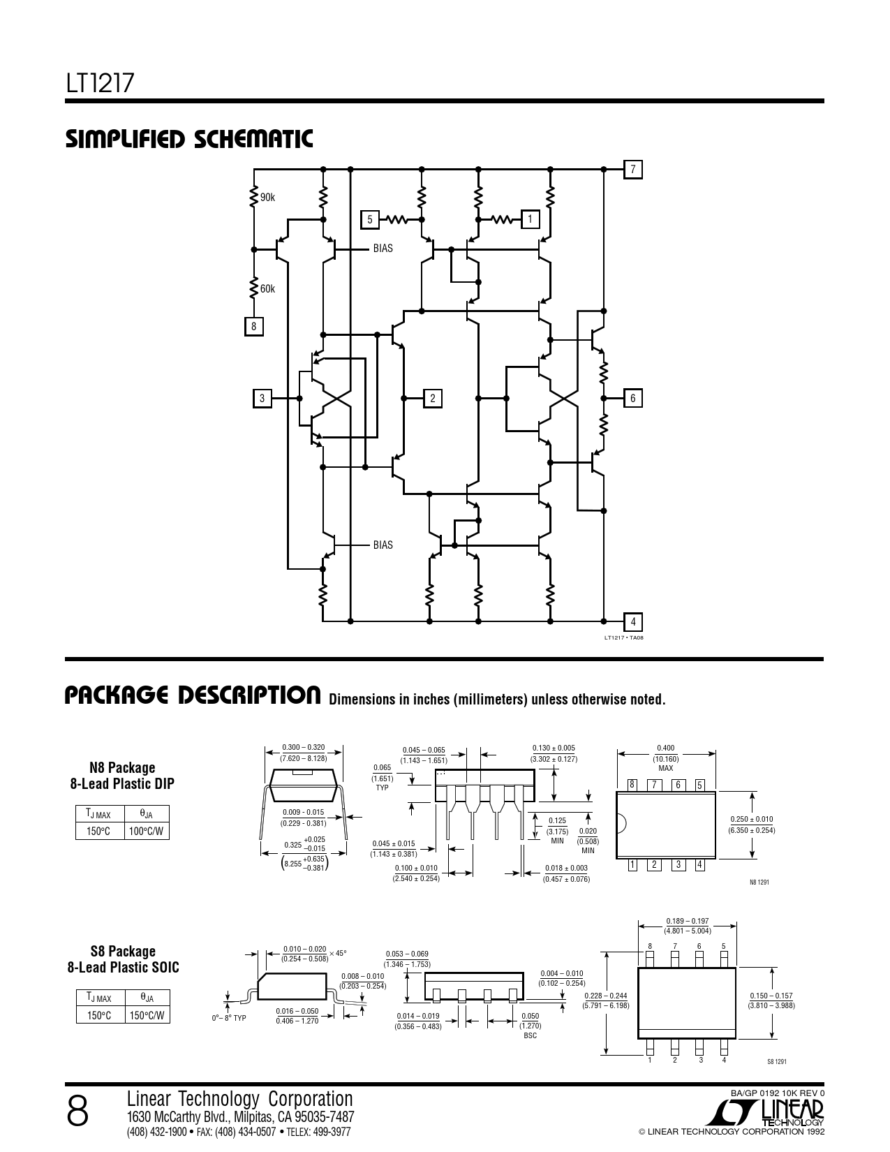(1.346 – 1.753) 0.008 – 0.010 0.004 – 0.010 (0.203 – 0.254) (0.102 – 0.254) TJ MAX θJA 0.228 – 0.244 0.150 – 0.157 (5.791 – 6.198) (3.810 – 3.988) 0.016 – 0.050 150°C 150°C/W 0°– 8° TYP 0.014 – 0.019 0.050 0.406 – 1.270 (0.356 – 0.483) (1.270) BSC 1 2 3 4 S8 1291 BA/GP 0192 10K REV 0 8 Linear Technology Corporation 1630 McCarthy Blvd., Milpitas, CA 95035-7487 (408) 432-1900 ● FAX: (408) 434-0507 ● TELEX: 499-3977 LINEAR TECHNOLOGY CORPORATION 1992