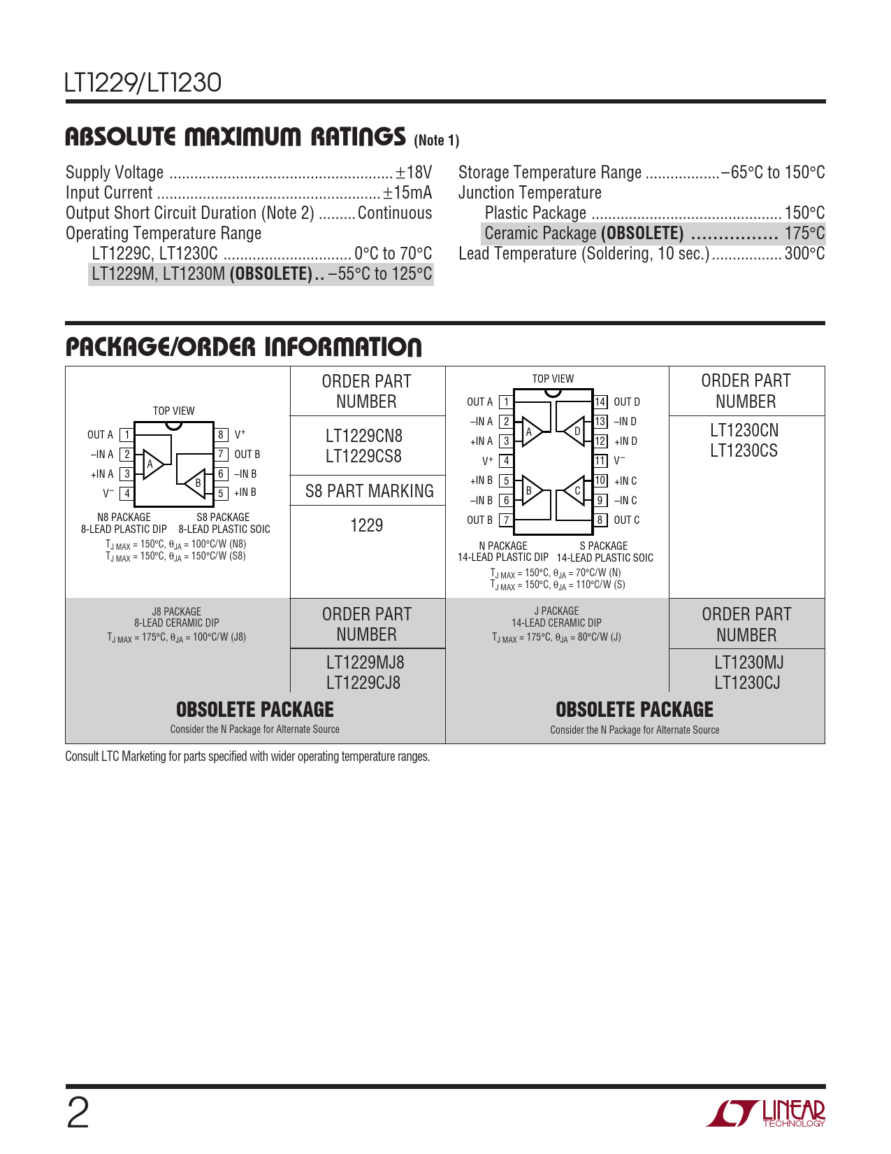 LT1229/LT1230 WWWUABSOLUTEAXI UAR TI GS (Note 1) Supply Voltage .. ±18V Storage Temperature Range ..–65°C to 150°C Input Current .. ±15mA Junction Temperature Output Short Circuit Duration (Note 2) ... Continuous Plastic Package .. 150°C Operating Temperature Range Ceramic Package (OBSOLETE) .. 175°C LT1229C, LT1230C ... 0°C to 70°C Lead Temperature (Soldering, 10 sec.)... 300°C LT1229M, LT1230M (OBSOLETE).. –55°C to 125°C UWUPACKAGE/ORDER I FOR ATIO ORDER PART TOP VIEW ORDER PART NUMBER OUT A 1 14 OUT D NUMBER TOP VIEW –IN A 2 13 –IN D + A D OUT A 1 8 V LT1230CN LT1229CN8 +IN A 3 12 +IN D –IN A 2 7 OUT B LT1230CS LT1229CS8 + V 4 11 V – A +IN A 3 6 –IN B +IN B 5 10 +IN C B – V 4 5 +IN B S8 PART MARKING B C –IN B 6 9 –IN C N8 PACKAGE S8 PACKAGE 8-LEAD PLASTIC DIP 8-LEAD PLASTIC SOIC 1229 OUT B 7 8 OUT C TJ MAX = 150°C, θJA = 100°C/W (N8) N PACKAGE S PACKAGE TJ MAX = 150°C, θJA = 150°C/W (S8) 14-LEAD PLASTIC DIP 14-LEAD PLASTIC SOIC TJ MAX = 150°C, θJA = 70°C/W (N) TJ MAX = 150°C, θJA = 110°C/W (S) J8 PACKAGE ORDER PART J PACKAGE ORDER PART 8-LEAD CERAMIC DIP 14-LEAD CERAMIC DIP T NUMBER NUMBER J MAX = 175°C, θJA = 100°C/ W (J8) TJ MAX = 175°C, θJA = 80°C/W (J) LT1229MJ8 LT1230MJ LT1229CJ8 LT1230CJ OBSOLETE PACKAGEOBSOLETE PACKAGE Consider the N Package for Alternate Source Consider the N Package for Alternate Source Consult LTC Marketing for parts specified with wider operating temperature ranges. 2