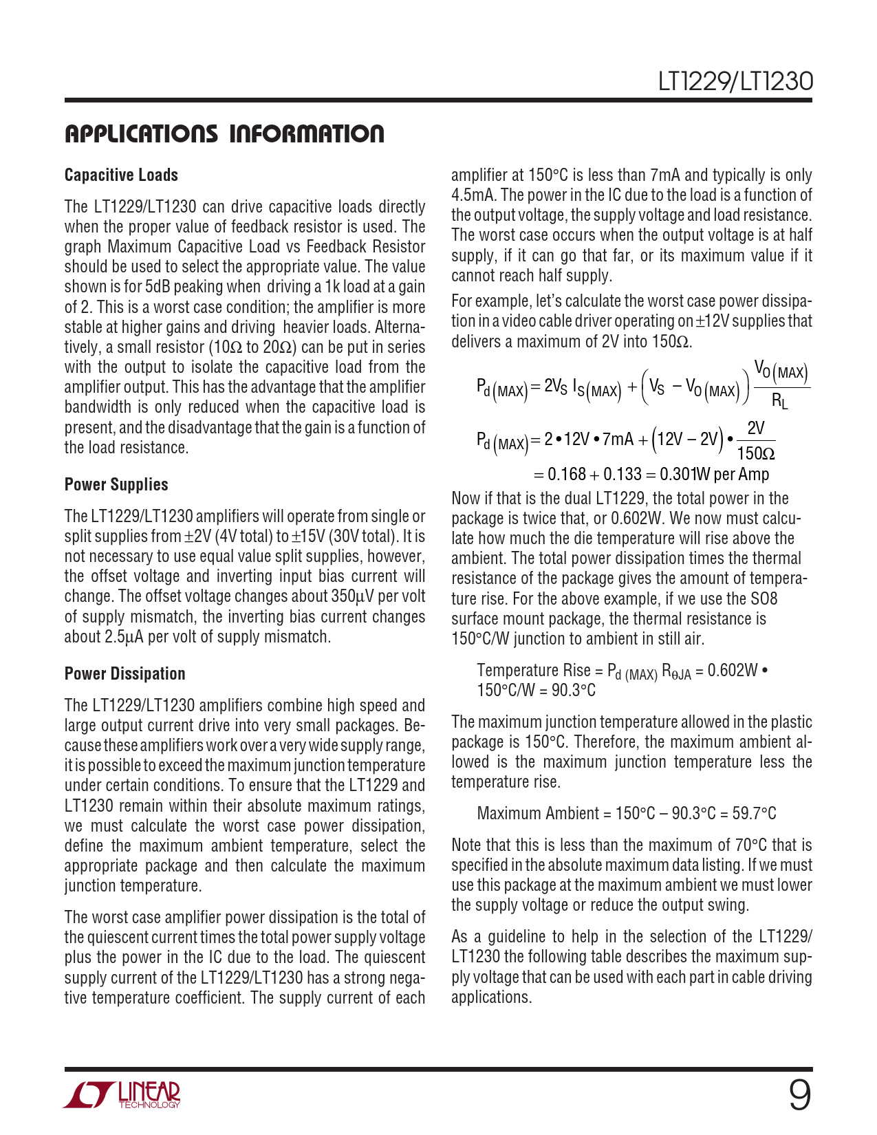 LT1229/LT1230 OUUWUAPPLICATIS I FOR ATIOCapacitive Loads amplifier at 150°C is less than 7mA and typically is only 4.5mA. The power in the IC due to the load is a function of The LT1229/LT1230 can drive capacitive loads directly the output voltage, the supply voltage and load resistance. when the proper value of feedback resistor is used. The The worst case occurs when the output voltage is at half graph Maximum Capacitive Load vs Feedback Resistor supply, if it can go that far, or its maximum value if it should be used to select the appropriate value. The value cannot reach half supply. shown is for 5dB peaking when driving a 1k load at a gain For example, let’s calculate the worst case power dissipa- of 2. This is a worst case condition; the amplifier is more tion in a video cable driver operating on ±12V supplies that stable at higher gains and driving heavier loads. Alterna- delivers a maximum of 2V into 150Ω. tively, a small resistor (10Ω to 20Ω) can be put in series with the output to isolate the capacitive load from the VO MAX ( ) amplifier output. This has the advantage that the amplifier P = V 2 I + V – V d MAX S S MAX S O MAX ( ) ( ) ( ) bandwidth is only reduced when the capacitive load is RL present, and the disadvantage that the gain is a function of V = 2 2 • 12 • 7 + (12 – 2 ) the load resistance. P V mA V V d MAX ( ) • 150Ω = 0.168 + 0 133 . = 0. W 301 per Amp Power Supplies Now if that is the dual LT1229, the total power in the The LT1229/LT1230 amplifiers will operate from single or package is twice that, or 0.602W. We now must calcu- split supplies from ±2V (4V total) to ±15V (30V total). It is late how much the die temperature will rise above the not necessary to use equal value split supplies, however, ambient. The total power dissipation times the thermal the offset voltage and inverting input bias current will resistance of the package gives the amount of tempera- change. The offset voltage changes about 350µV per volt ture rise. For the above example, if we use the SO8 of supply mismatch, the inverting bias current changes surface mount package, the thermal resistance is about 2.5µA per volt of supply mismatch. 150°C/W junction to ambient in still air. Power Dissipation Temperature Rise = Pd (MAX) RθJA = 0.602W • 150°C/W = 90.3°C The LT1229/LT1230 amplifiers combine high speed and large output current drive into very small packages. Be- The maximum junction temperature allowed in the plastic cause these amplifiers work over a very wide supply range, package is 150°C. Therefore, the maximum ambient al- it is possible to exceed the maximum junction temperature lowed is the maximum junction temperature less the under certain conditions. To ensure that the LT1229 and temperature rise. LT1230 remain within their absolute maximum ratings, Maximum Ambient = 150°C – 90.3°C = 59.7°C we must calculate the worst case power dissipation, define the maximum ambient temperature, select the Note that this is less than the maximum of 70°C that is appropriate package and then calculate the maximum specified in the absolute maximum data listing. If we must junction temperature. use this package at the maximum ambient we must lower the supply voltage or reduce the output swing. The worst case amplifier power dissipation is the total of the quiescent current times the total power supply voltage As a guideline to help in the selection of the LT1229/ plus the power in the IC due to the load. The quiescent LT1230 the following table describes the maximum sup- supply current of the LT1229/LT1230 has a strong nega- ply voltage that can be used with each part in cable driving tive temperature coefficient. The supply current of each applications. 9