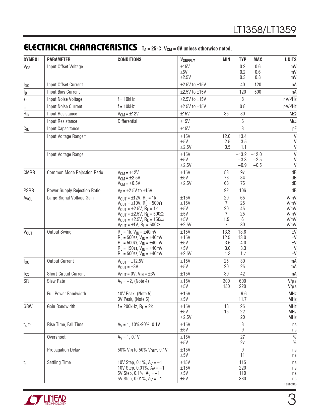 VOS Input Offset Voltage ±15V 0.2 0.6 mV ±5V 0.2 0.6 mV ±2.5V 0.3 0.8 mV IOS Input Offset Current ±2.5V to ±15V 40 120 nA IB Input Bias Current ±2.5V to ±15V 120 500 nA en Input Noise Voltage f = 10kHz ±2.5V to ±15V 8 nV/√Hz in Input Noise Current f = 10kHz ±2.5V to ±15V 0.8 pA/√Hz RIN Input Resistance VCM = ±12V ±15V 35 80 MΩ Input Resistance Differential ±15V 6 MΩ CIN Input Capacitance ±15V 3 pF Input Voltage Range + ±15V 12.0 13.4 V ±5V 2.5 3.5 V ±2.5V 0.5 1.1 V Input Voltage Range – ±15V –13.2 –12.0 V ±5V –3.3 – 2.5 V ±2.5V –0.9 – 0.5 V CMRR Common Mode Rejection Ratio VCM = ±12V ±15V 83 97 dB VCM = ±2.5V ±5V 78 84 dB VCM = ±0.5V ±2.5V 68 75 dB PSRR Power Supply Rejection Ratio VS = ±2.5V to ±15V 92 106 dB AVOL Large-Signal Voltage Gain VOUT = ±12V, RL = 1k ±15V 20 65 V/mV VOUT = ±10V, RL = 500Ω ±15V 7 25 V/mV VOUT = ±2.5V, RL = 1k ±5V 20 45 V/mV VOUT = ±2.5V, RL = 500Ω ±5V 7 25 V/mV VOUT = ±2.5V, RL = 150Ω ±5V 1.5 6 V/mV VOUT = ±1V, RL = 500Ω ±2.5V 7 30 V/mV VOUT Output Swing RL = 1k, VIN = ±40mV ±15V 13.3 13.8 ±V RL = 500Ω, VIN = ±40mV ±15V 12.5 13.0 ±V RL = 500Ω, VIN = ±40mV ±5V 3.5 4.0 ±V RL = 150Ω, VIN = ±40mV ±5V 3.0 3.3 ±V RL = 500Ω, VIN = ±40mV ±2.5V 1.3 1.7 ±V IOUT Output Current VOUT = ±12.5V ±15V 25 30 mA VOUT = ±3V ±5V 20 25 mA ISC Short-Circuit Current VOUT = 0V, VIN = ±3V ±15V 30 42 mA SR Slew Rate AV = – 2, (Note 4) ±15V 300 600 V/µs ±5V 150 220 V/µs Full Power Bandwidth 10V Peak, (Note 5) ±15V 9.6 MHz 3V Peak, (Note 5) ±5V 11.7 MHz GBW Gain Bandwidth f = 200kHz, RL = 2k ±15V 18 25 MHz ±5V 15 22 MHz ±2.5V 20 MHz tr, tf Rise Time, Fall Time AV = 1, 10%-90%, 0.1V ±15V 8 ns ±5V 9 ns Overshoot AV = 1, 0.1V ±15V 27 % ±5V 27 % Propagation Delay 50% VIN to 50% VOUT, 0.1V ±15V 9 ns ±5V 11 ns ts Settling Time 10V Step, 0.1%, AV = –1 ±15V 115 ns 10V Step, 0.01%, AV = –1 ±15V 220 ns 5V Step, 0.1%, AV = –1 ±5V 110 ns 5V Step, 0.01%, AV = –1 ±5V 380 ns 135859fb 3