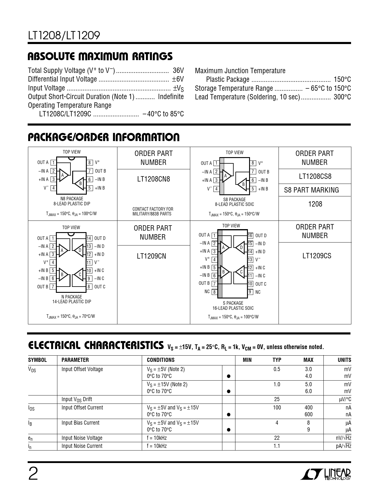 LT1208/LT1209 WWWUABSOLUTEAXI UAR TI GS Total Supply Voltage (V+ to V–) .. 36V Maximum Junction Temperature Differential Input Voltage .. ±6V Plastic Package ... 150°C Input Voltage ... ±VS Storage Temperature Range .. – 65°C to 150°C Output Short-Circuit Duration (Note 1) ... Indefinite Lead Temperature (Soldering, 10 sec) ... 300°C Operating Temperature Range LT1208C/LT1209C .. – 40°C to 85°C UWUPACKAGE/ORDER I FOR ATIO TOP VIEW ORDER PART TOP VIEW ORDER PART OUT A 1 8 V+ NUMBER OUT A 1 8 V+ NUMBER –IN A 2 7 OUT B –IN A 2 7 OUT B A A LT1208CS8 +IN A 3 6 –IN B LT1208CN8 +IN A 3 6 –IN B B B V– 4 5 +IN B V– 4 5 +IN B S8 PART MARKING N8 PACKAGE S8 PACKAGE 8-LEAD PLASTIC DIP 8-LEAD PLASTIC SOIC 1208 CONTACT FACTORY FOR TJMAX = 150°C, θJA = 100°C/W MILITARY/883B PARTS TJMAX = 150°C, θJA = 150°C/W TOP VIEW ORDER PART TOP VIEW ORDER PART OUT A 1 16 OUT D OUT A 1 14 OUT D NUMBER NUMBER –IN A 2 15 –IN D –IN A 2 13 –IN D A D A D +IN A 3 14 +IN D +IN A 3 12 +IN D LT1209CN LT1209CS V+ 4 13 V – V+ 4 11 V – +IN B 5 12 +IN C +IN B 5 10 +IN C B C B C –IN B 6 11 –IN C –IN B 6 9 –IN C OUT B 7 10 OUT C OUT B 7 8 OUT C NC 8 9 NC N PACKAGE 14-LEAD PLASTIC DIP S PACKAGE 16-LEAD PLASTIC SOIC TJMAX = 150°C, θJA = 70°C/W TJMAX = 150°C, θJA = 100°C/W ELECTRICAL CHAR CA TERISTICS VS = ± 15V, TA = 25 ° C, RL = 1k, VCM = 0V, unless otherwise noted.SYMBOLPARAMETERCONDITIONSMINTYPMAXUNITS VOS Input Offset Voltage VS = ±5V (Note 2) 0.5 3.0 mV 0°C to 70°C ● 4.0 mV VS = ±15V (Note 2) 1.0 5.0 mV 0°C to 70°C ● 6.0 mV Input VOS Drift 25 µV/°C IOS Input Offset Current VS = ±5V and VS = ±15V 100 400 nA 0°C to 70°C ● 600 nA IB Input Bias Current VS = ±5V and VS = ±15V 4 8 µA 0°C to 70°C ● 9 µA en Input Noise Voltage f = 10kHz 22 nV/√Hz in Input Noise Current f = 10kHz 1.1 pA/√Hz 2