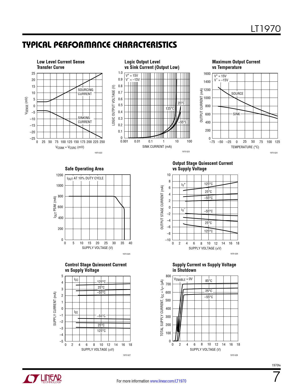 25 1.0 V+ = 15V 1600 V+ = 15V 20 0.9 V– = –15V 1400 V– = –15V 15 0.8 SOURCING 1200 10 CURRENT 0.7 SOURCE 5 0.6 1000 (mV) 25°C 0 0.5 800 125°C V SENSE –5 0.4 600 SINK –10 SINKING 0.3 CURRENT –55°C OUTPUT CURRENT (mA) 400 –15 LOGIC OUTPUT VOLTAGE (V) 0.2 –20 0.1 200 –25 0 0 0 25 50 75 100 125 150 175 200 225 250 0.001 0.01 0.1 1 10 100 –75 –50 –25 0 25 50 75 100 125 VCSNK = VCSRC (mV) SINK CURRENT (mA) TEMPERATURE (°C) 1970 G22 1970 G23 1970 G24
