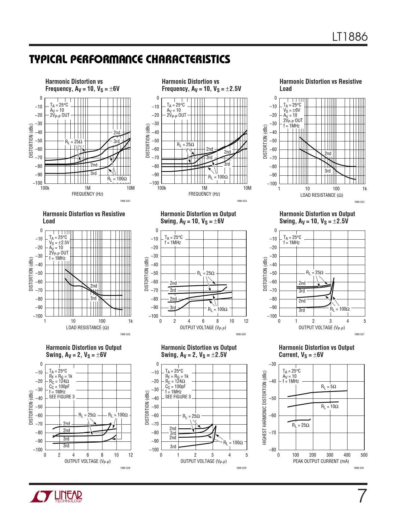 0 0 –30 –10 TA = 25°C –10 TA = 25°C TA = 25°C RF = RG = 1k RF = RG = 1k AV = 10 –20 RC = 124Ω –20 RC = 124Ω –40 f = 1MHz C C R –30 C = 100pF C = 100pF L = 5Ω f = 1MHz –30 f = 1MHz –40 SEE FIGURE 3 –40 SEE FIGURE 3 –50 –50 –50 RL = 10Ω –60 RL = 25Ω RL = 100Ω –60 R –60 L = 25Ω DISTORTION (dBc) –70 2nd DISTORTION (dBc) –70 RL = 25Ω 2nd –80 2nd –80 3rd –70 3rd 2nd –90 –90 R HIGHEST HARMONIC DISTORTION (dBc) 3rd L = 100Ω 3rd –100 –100 –80 0 2 4 6 8 10 12 0 1 2 3 4 5 0 100 200 300 400 500 OUTPUT VOLTAGE (VP-P) OUTPUT VOLTAGE (VP-P) PEAK OUTPUT CURRENT (mA) 1886 G28 1886 G29 1886 G30 7