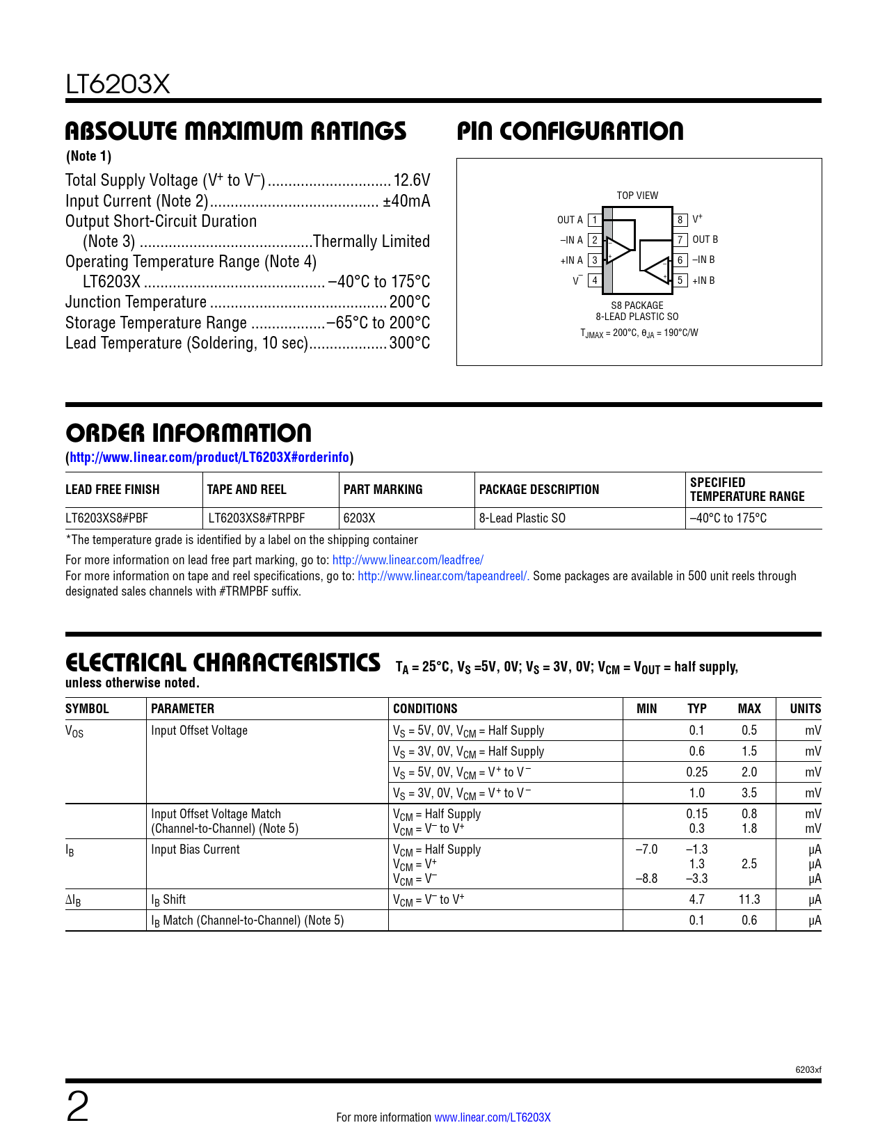 LT6203XS8#PBF LT6203XS8#TRPBF 6203X 8-Lead Plastic SO –40°C to 175°C *The temperature grade is identified by a label on the shipping container For more information on lead free part marking, go to: http://www.linear.com/leadfree/ For more information on tape and reel specifications, go to: http://www.linear.com/tapeandreel/. Some packages are available in 500 unit reels through designated sales channels with #TRMPBF suffix.