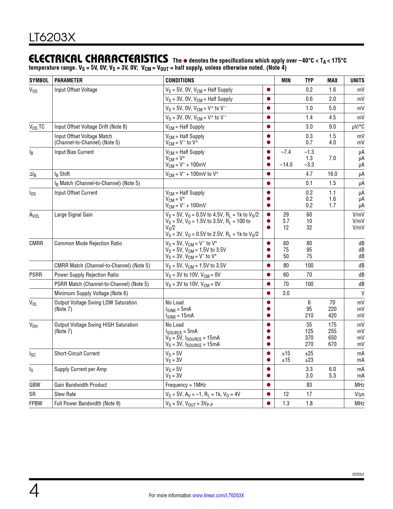 LT6203X elecTrical characTerisTicsThe l denotes the specifications which apply over –40°C < TA < 175°Ctemperature range. VS = 5V, 0V; VS = 3V, 0V; VCM = VOUT = half supply, unless otherwise noted. (Note 4)SYMBOL PARAMETERCONDITIONSMINTYPMAXUNITS VOS Input Offset Voltage VS = 5V, 0V, VCM = Half Supply l 0.2 1.6 mV VS = 3V, 0V, VCM = Half Supply l 0.6 2.0 mV VS = 5V, 0V, VCM = V+ to V – l 1.0 5.0 mV VS = 3V, 0V, VCM = V+ to V – l 1.4 4.5 mV VOS TC Input Offset Voltage Drift (Note 8) VCM = Half Supply l 3.0 9.0 µV/°C Input Offset Voltage Match VCM = Half Supply l 0.3 1.5 mV (Channel-to-Channel) (Note 5) VCM = V– to V+ l 0.7 4.0 mV IB Input Bias Current VCM = Half Supply l –7.4 –1.3 µA VCM = V+ l 1.3 7.0 µA VCM = V– + 100mV l –14.0 –3.3 µA ∆IB IB Shift VCM = V– + 100mV to V+ l 4.7 16.0 µA IB Match (Channel-to-Channel) (Note 5) l 0.1 1.5 µA IOS Input Offset Current VCM = Half Supply l 0.2 1.1 µA VCM = V+ l 0.2 1.6 µA VCM = V– + 100mV l 0.2 1.7 µA AVOL Large Signal Gain VS = 5V, VO = 0.5V to 4.5V, RL = 1k to VS/2 l 29 60 V/mV VS = 5V, VO = 1.5V to 3.5V, RL = 100 to l 3.7 10 V/mV VS/2 l 12 32 V/mV VS = 3V, VO = 0.5V to 2.5V, RL = 1k to VS/2 CMRR Common Mode Rejection Ratio VS = 5V, VCM = V– to V+ l 60 80 dB VS = 5V, VCM = 1.5V to 3.5V l 75 95 dB VS = 3V, VCM = V – to V+ l 50 75 dB CMRR Match (Channel-to-Channel) (Note 5) VS = 5V, VCM = 1.5V to 3.5V l 80 100 dB PSRR Power Supply Rejection Ratio VS = 3V to 10V, VCM = 0V l 60 70 dB PSRR Match (Channel-to-Channel) (Note 5) VS = 3V to 10V, VCM = 0V l 70 100 dB Minimum Supply Voltage (Note 6) l 3.0 V VOL Output Voltage Swing LOW Saturation No Load l 6 70 mV (Note 7) ISINK = 5mA l 95 220 mV ISINK = 15mA l 210 420 mV VOH Output Voltage Swing HIGH Saturation No Load l 55 175 mV (Note 7) ISOURCE = 5mA l 125 255 mV VS = 5V, ISOURCE = 15mA l 370 650 mV VS = 3V, ISOURCE = 15mA l 270 670 mV ISC Short-Circuit Current VS = 5V l ±15 ±25 mA VS = 3V l ±15 ±23 mA IS Supply Current per Amp VS = 5V l 3.3 6.0 mA VS = 3V l 3.0 5.3 mA GBW Gain Bandwidth Product Frequency = 1MHz l 83 MHz SR Slew Rate VS = 5V, AV = –1, RL = 1k, VO = 4V l 12 17 V/µs FPBW Full Power Bandwidth (Note 9) VS = 5V, VOUT = 3VP-P l 1.3 1.8 MHz 6203xf 4 For more information www.linear.com/LT6203X Document Outline Features Applications Description Typical Application Absolute Maximum Ratings Electrical Characteristics Typical Performance Characteristics Applications Information Typical Application Related Parts Features Applications Typical Application Description Absolute Maximum Ratings Order Information Pin Configuration Electrical Characteristics Typical Performance Characteristics Applications Information Package Description Typical Application Related Parts
