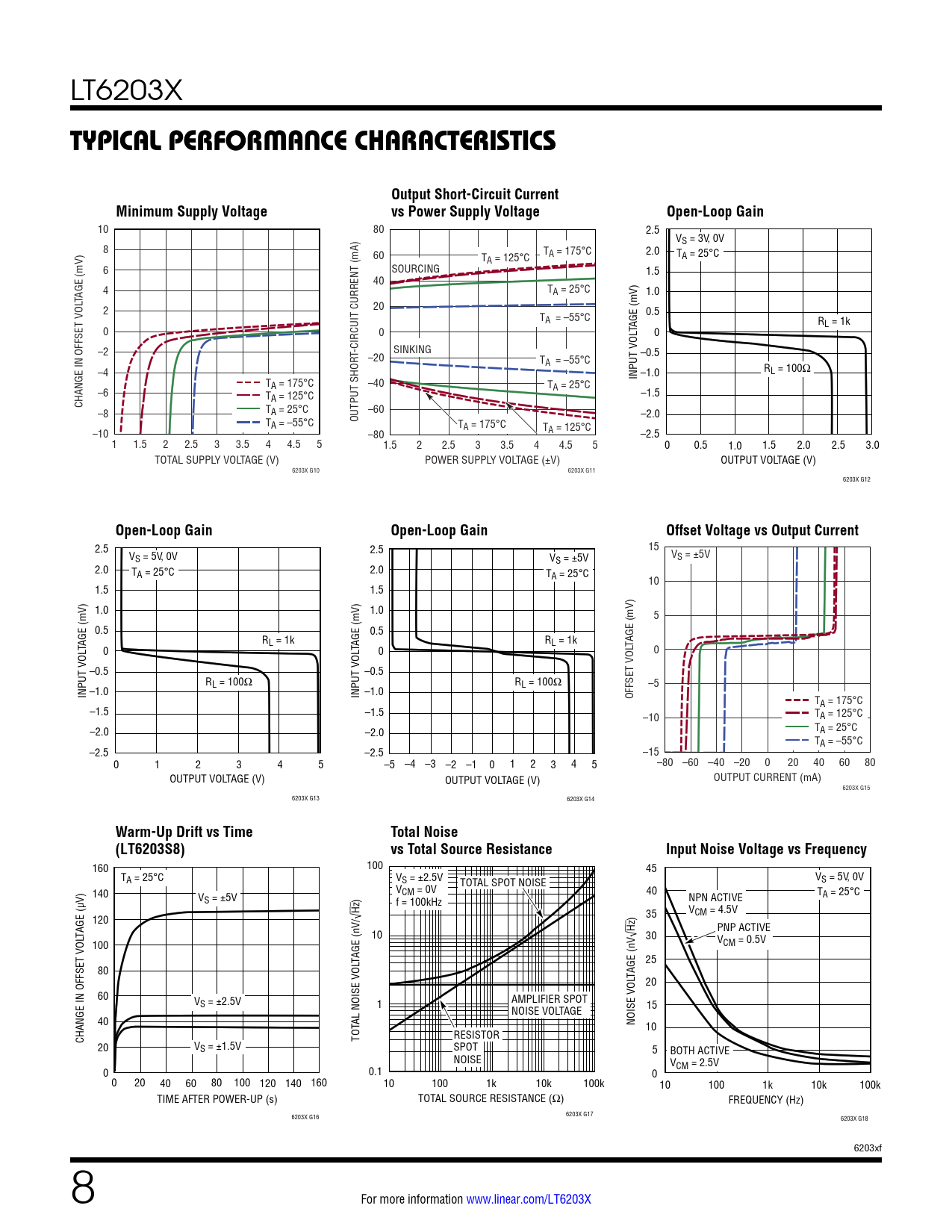 LT6203X Typical perForMance characTerisTicsOutput Short-Circuit CurrentMinimum Supply Voltagevs Power Supply VoltageOpen-Loop Gain 10 80 2.5 VS = 3V, 0V 8 T 60 A = 175°C 2.0 T T A = 125°C A = 25°C 6 SOURCING 1.5 40 4 TA = 25°C 1.0 TAGE (mV) 2 20 T 0.5 A = –55°C RL = 1k 0 0 TAGE (mV) 0 –2 SINKING T-CIRCUIT CURRENT (mA) –20 –0.5 TA = –55°C –4 R INPUT VOL –1.0 L = 100Ω TA = 175°C –40 T –6 A = 25°C T –1.5 CHANGE IN OFFSET VOL A = 125°C –8 TA = 25°C –60 –2.0 T OUTPUT SHOR A = –55°C TA = 175°C T –10 A = 125°C –80 –2.5 1 1.5 2 2.5 3 3.5 4 4.5 5 1.5 2 2.5 3 3.5 4 4.5 5 0 0.5 1.0 1.5 2.0 2.5 3.0 TOTAL SUPPLY VOLTAGE (V) POWER SUPPLY VOLTAGE (±V) OUTPUT VOLTAGE (V) 6203X G10 6203X G11 6203X G12 Open-Loop GainOpen-Loop GainOffset Voltage vs Output Current 2.5 2.5 15 VS = 5V, 0V V V S = ±5V S = ±5V 2.0 TA = 25°C 2.0 TA = 25°C 10 1.5 1.5 1.0 1.0 5 0.5 0.5 R R TAGE (mV) L = 1k L = 1k TAGE (mV) 0 TAGE (mV) 0 0 –0.5 –0.5 RL = 100Ω RL = 100Ω –5 INPUT VOL –1.0 INPUT VOL –1.0 OFFSET VOL TA = 175°C –1.5 –1.5 –10 TA = 125°C –2.0 –2.0 TA = 25°C TA = –55°C –2.5 –2.5 –15 0 1 2 3 4 5 –5 –4 –3 –2 –1 0 1 2 3 4 5 –80 –60 –40 –20 0 20 40 60 80 OUTPUT VOLTAGE (V) OUTPUT VOLTAGE (V) OUTPUT CURRENT (mA) 6203X G15 6203X G13 6203X G14 Warm-Up Drift vs TimeTotal Noise(LT6203S8)vs Total Source ResistanceInput Noise Voltage vs Frequency 160 100 45 TA = 25°C VS = ±2.5V TOTAL SPOT NOISE VS = 5V, 0V V 40 T V) 140 V CM = 0V A = 25°C S = ±5V ) f = 100kHz NPN ACTIVE Hz VCM = 4.5V 120 /√ ) 35 TAGE (µ Hz PNP ACTIVE 10 30 100 VCM = 0.5V TAGE (nV 25 80 TAGE (nV√ 20 60 VS = ±2.5V 1 AMPLIFIER SPOT NOISE VOLTAGE 15 40 AL NOISE VOL NOISE VOL 10 CHANGE IN OFFSET VOL TOT RESISTOR 20 VS = ±1.5V SPOT 5 BOTH ACTIVE NOISE VCM = 2.5V 0 0.1 0 0 20 40 60 80 100 120 140 160 10 100 1k 10k 100k 10 100 1k 10k 100k TIME AFTER POWER-UP (s) TOTAL SOURCE RESISTANCE (Ω) FREQUENCY (Hz) 6203X G16 6203X G17 6203X G18 6203xf 8 For more information www.linear.com/LT6203X Document Outline Features Applications Description Typical Application Absolute Maximum Ratings Electrical Characteristics Typical Performance Characteristics Applications Information Typical Application Related Parts Features Applications Typical Application Description Absolute Maximum Ratings Order Information Pin Configuration Electrical Characteristics Typical Performance Characteristics Applications Information Package Description Typical Application Related Parts