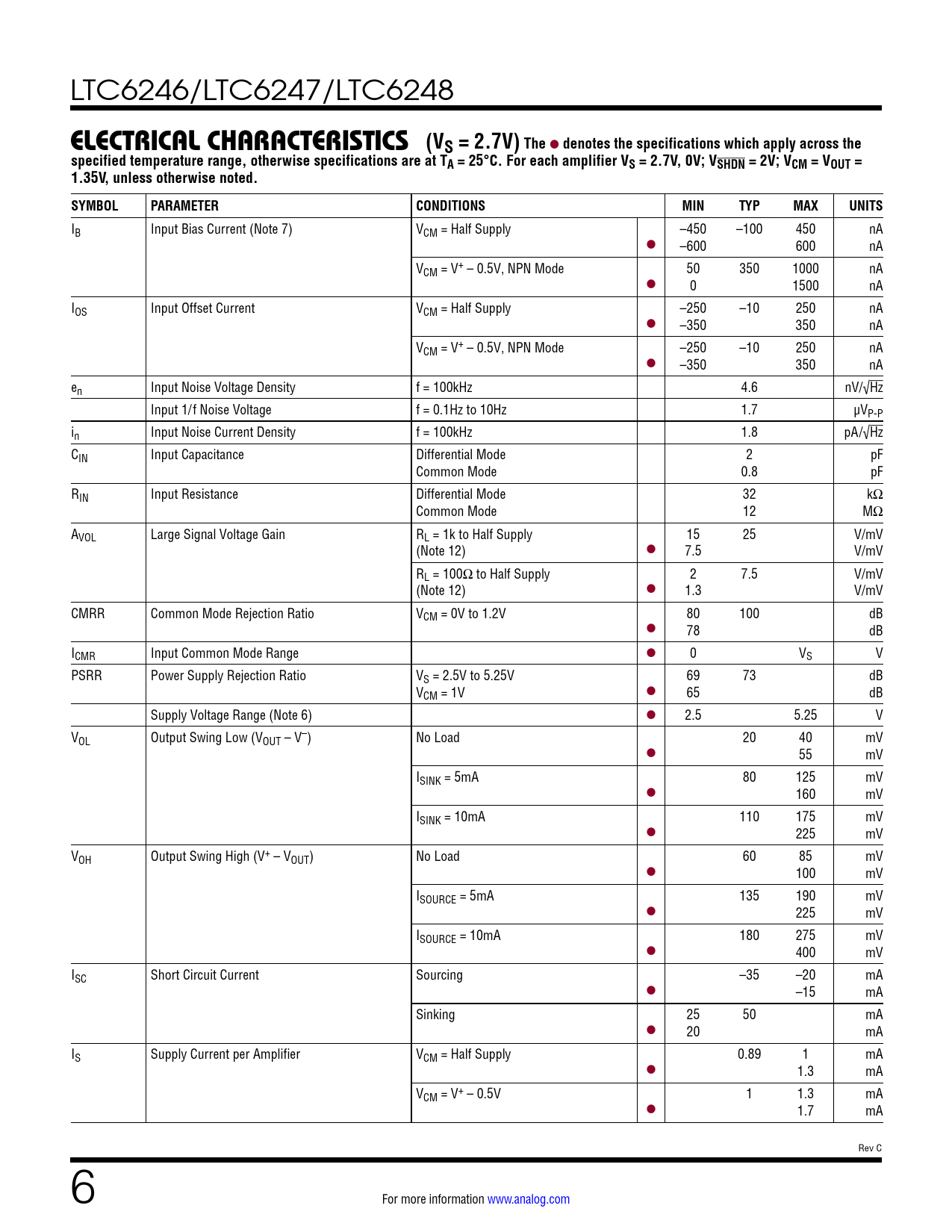 LTC6246/LTC6247/LTC6248 ELECTRICAL CHARACTERISTICS(VS = 2.7V) The l denotes the specifications which apply across thespecified temperature range, otherwise specifications are at TA = 25°C. For each amplifier VS = 2.7V, 0V; VSHDN = 2V; VCM = VOUT =1.35V, unless otherwise noted.SYMBOLPARAMETERCONDITIONSMINTYPMAXUNITS IB Input Bias Current (Note 7) VCM = Half Supply –450 –100 450 nA l –600 600 nA VCM = V+ – 0.5V, NPN Mode 50 350 1000 nA l 0 1500 nA IOS Input Offset Current VCM = Half Supply –250 –10 250 nA l –350 350 nA VCM = V+ – 0.5V, NPN Mode –250 –10 250 nA l –350 350 nA en Input Noise Voltage Density f = 100kHz 4.6 nV/√Hz Input 1/f Noise Voltage f = 0.1Hz to 10Hz 1.7 µVP-P in Input Noise Current Density f = 100kHz 1.8 pA/√Hz CIN Input Capacitance Differential Mode 2 pF Common Mode 0.8 pF RIN Input Resistance Differential Mode 32 kΩ Common Mode 12 MΩ AVOL Large Signal Voltage Gain RL = 1k to Half Supply 15 25 V/mV (Note 12) l 7.5 V/mV RL = 100Ω to Half Supply 2 7.5 V/mV (Note 12) l 1.3 V/mV CMRR Common Mode Rejection Ratio VCM = 0V to 1.2V 80 100 dB l 78 dB ICMR Input Common Mode Range l 0 VS V PSRR Power Supply Rejection Ratio VS = 2.5V to 5.25V 69 73 dB VCM = 1V l 65 dB Supply Voltage Range (Note 6) l 2.5 5.25 V VOL Output Swing Low (VOUT – V–) No Load 20 40 mV l 55 mV ISINK = 5mA 80 125 mV l 160 mV ISINK = 10mA 110 175 mV l 225 mV VOH Output Swing High (V+ – VOUT) No Load 60 85 mV l 100 mV ISOURCE = 5mA 135 190 mV l 225 mV ISOURCE = 10mA 180 275 mV l 400 mV ISC Short Circuit Current Sourcing –35 –20 mA l –15 mA Sinking 25 50 mA l 20 mA IS Supply Current per Amplifier VCM = Half Supply 0.89 1 mA l 1.3 mA VCM = V+ – 0.5V 1 1.3 mA l 1.7 mA Rev C 6 For more information www.analog.com Document Outline Features Applications Description Typical Application Absolute Maximum Ratings Pin Configuration Order Information Electrical Characteristics Typical Performance Characteristics Pin Functions Applications Information Typical Applications Revision History Typical Application Related Parts