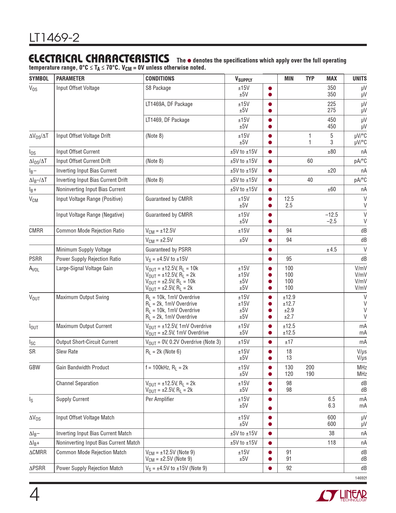 VOS Input Offset Voltage S8 Package ±15V ● 350 μV ±5V ● 350 μV LT1469A, DF Package ±15V ● 225 μV ±5V ● 275 μV LT1469, DF Package ±15V ● 450 μV ±5V ● 450 μV ΔVOS/ΔT Input Offset Voltage Drift (Note 8) ±15V ● 1 5 μV/°C ±5V ● 1 3 μV/°C IOS Input Offset Current ±5V to ±15V ● ±80 nA ΔIOS/ΔT Input Offset Current Drift (Note 8) ±5V to ±15V ● 60 pA/°C IB– Inverting Input Bias Current ±5V to ±15V ● ±20 nA ΔIB–/ΔT Inverting Input Bias Current Drift (Note 8) ±5V to ±15V ● 40 pA/°C IB+ Noninverting Input Bias Current ±5V to ±15V ● ±60 nA VCM Input Voltage Range (Positive) Guaranteed by CMRR ±15V ● 12.5 V ±5V ● 2.5 V Input Voltage Range (Negative) Guaranteed by CMRR ±15V ● –12.5 V ±5V ● –2.5 V CMRR Common Mode Rejection Ratio VCM = ±12.5V ±15V ● 94 dB VCM = ±2.5V ±5V ● 94 dB Minimum Supply Voltage Guaranteed by PSRR ● ± 4.5 V PSRR Power Supply Rejection Ratio VS = ±4.5V to ±15V ● 95 dB AVOL Large-Signal Voltage Gain VOUT = ±12.5V, RL = 10k ±15V ● 100 V/mV VOUT = ±12.5V, RL = 2k ±15V ● 100 V/mV VOUT = ±2.5V, RL = 10k ±5V ● 100 V/mV VOUT = ±2.5V, RL = 2k ±5V ● 100 V/mV VOUT Maximum Output Swing RL = 10k, 1mV Overdrive ±15V ● ±12.9 V RL = 2k, 1mV Overdrive ±15V ● ±12.7 V RL = 10k, 1mV Overdrive ±5V ● ±2.9 V RL = 2k, 1mV Overdrive ±5V ● ±2.7 V IOUT Maximum Output Current VOUT = ±12.5V, 1mV Overdrive ±15V ● ±12.5 mA VOUT = ±2.5V, 1mV Overdrive ±5V ● ±12.5 mA ISC Output Short-Circuit Current VOUT = 0V, 0.2V Overdrive (Note 3) ±15V ● ±17 mA SR Slew Rate RL = 2k (Note 6) ±15V ● 18 V/μs ±5V ● 13 V/μs GBW Gain Bandwidth Product f = 100kHz, RL = 2k ±15V ● 130 200 MHz ±5V ● 120 190 MHz Channel Separation VOUT = ±12.5V, RL = 2k ±15V ● 98 dB VOUT = ±2.5V, RL = 2k ±5V ● 98 dB IS Supply Current Per Amplifi er ±15V ● 6.5 mA ±5V ● 6.3 mA ΔVOS Input Offset Voltage Match ±15V ● 600 μV ±5V ● 600 μV ΔIB– Inverting Input Bias Current Match ±5V to ±15V ● 38 nA ΔIB+ Noninverting Input Bias Current Match ±5V to ±15V ● 118 nA ΔCMRR Common Mode Rejection Match VCM = ±12.5V (Note 9) ±15V ● 91 dB VCM = ±2.5V (Note 9) ±5V ● 91 dB ΔPSRR Power Supply Rejection Match VS = ±4.5V to ±15V (Note 9) ● 92 dB 14692f 4