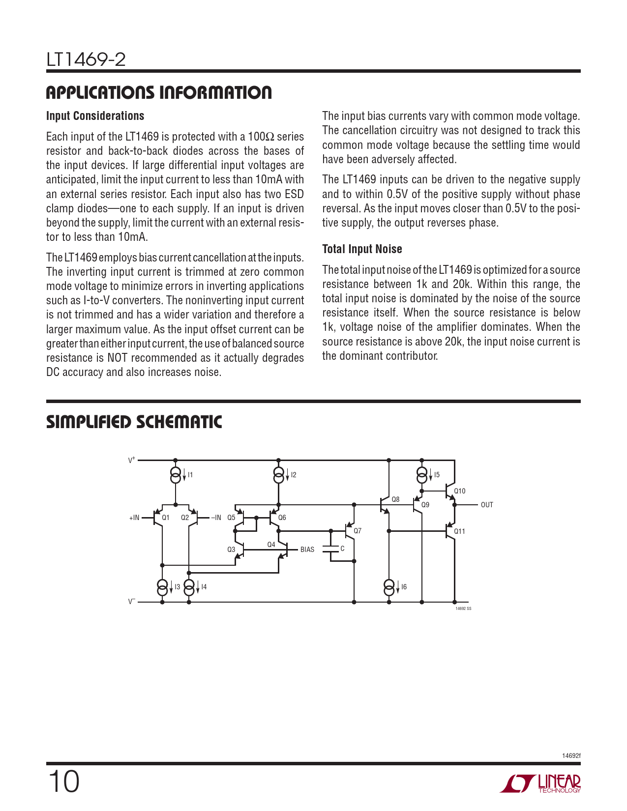 The LT1469 employs bias current cancellation at the inputs. The inverting input current is trimmed at zero common The total input noise of the LT1469 is optimized for a source mode voltage to minimize errors in inverting applications resistance between 1k and 20k. Within this range, the such as I-to-V converters. The noninverting input current total input noise is dominated by the noise of the source is not trimmed and has a wider variation and therefore a resistance itself. When the source resistance is below larger maximum value. As the input offset current can be 1k, voltage noise of the amplifi er dominates. When the greater than either input current, the use of balanced source source resistance is above 20k, the input noise current is resistance is NOT recommended as it actually degrades the dominant contributor. DC accuracy and also increases noise.