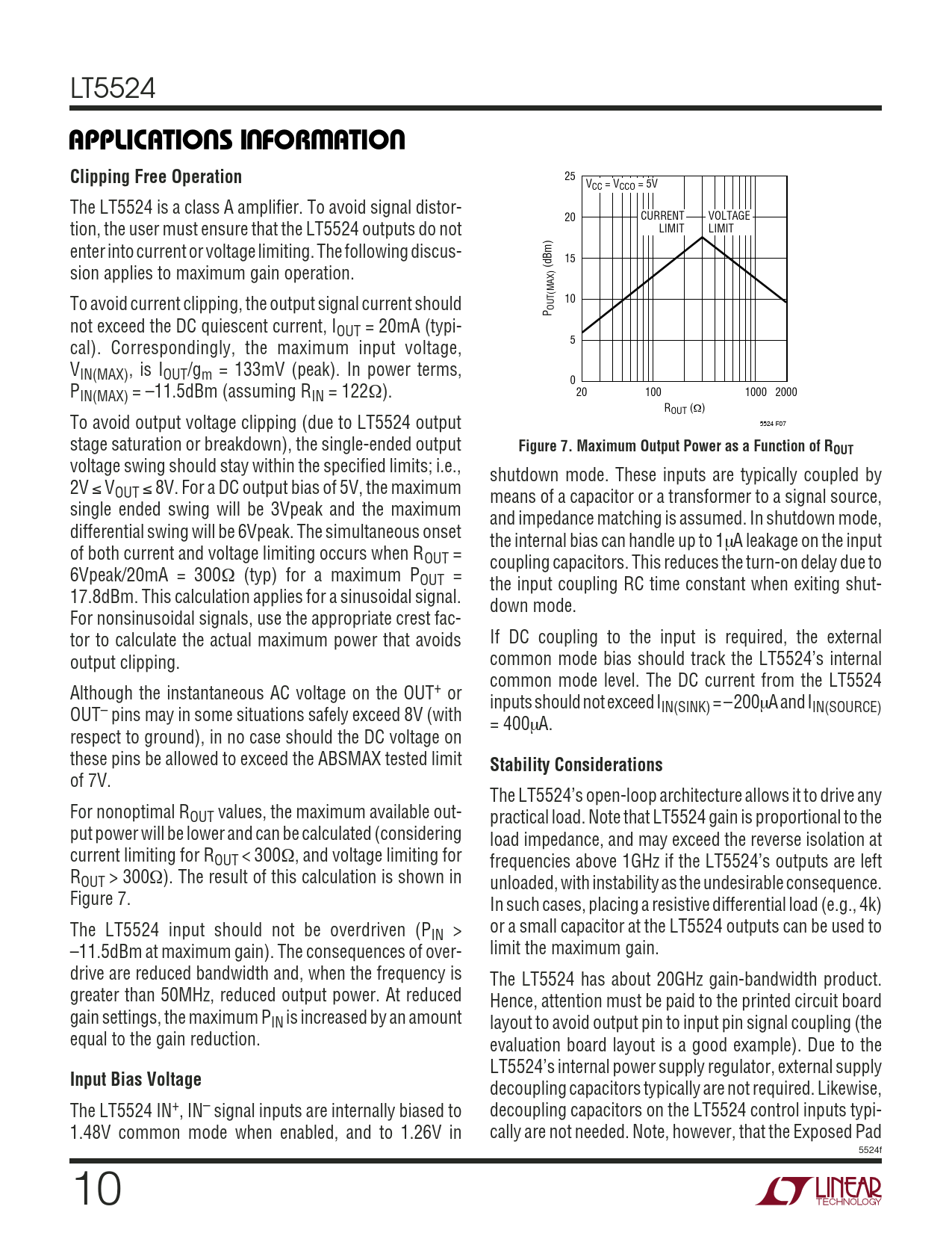 25 VCC = VCCO = 5V The LT5524 is a class A amplifier. To avoid signal distor- 20 CURRENT VOLTAGE tion, the user must ensure that the LT5524 outputs do not LIMIT LIMIT enter into current or voltage limiting. The following discus- 15 sion applies to maximum gain operation. (dBm) To avoid current clipping, the output signal current should 10 OUT(MAX)P not exceed the DC quiescent current, IOUT = 20mA (typi- cal). Correspondingly, the maximum input voltage, 5 VIN(MAX), is IOUT/gm = 133mV (peak). In power terms, 0 PIN(MAX) = –11.5dBm (assuming RIN = 122Ω). 20 100 1000 2000 ROUT (Ω) To avoid output voltage clipping (due to LT5524 output 5524 F07 stage saturation or breakdown), the single-ended output