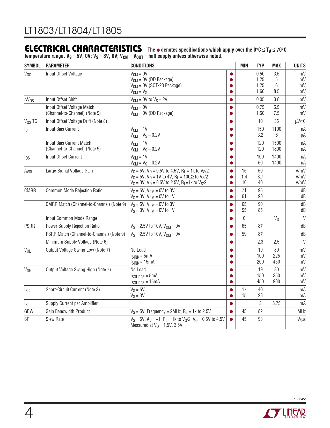LT1803/LT1804/LT1805 ELECTRICAL CHARACTERISTICS The ● denotes specifications which apply over the 0 ° C ≤ TA ≤ 70 ° Ctemperature range. VS = 5V, 0V; VS = 3V, 0V; VCM = VOUT = half supply unless otherwise noted.SYMBOLPARAMETERCONDITIONSMINTYPMAXUNITS VOS Input Offset Voltage VCM = 0V ● 0.50 3.5 mV VCM = 0V (DD Package) ● 1.25 5 mV VCM = 0V (SOT-23 Package) ● 1.25 6 mV VCM = VS ● 1.60 8.5 mV ∆VOS Input Offset Shift VCM = 0V to VS – 2V ● 0.05 0.8 mV Input Offset Voltage Match VCM = 0V ● 0.75 5.5 mV (Channel-to-Channel) (Note 9) VCM = 0V (DD Package) ● 1.50 7.5 mV VOS TC Input Offset Voltage Drift (Note 8) ● 10 35 µV/°C IB Input Bias Current VCM = 1V ● 150 1100 nA VCM = VS – 0.2V ● 3.2 6 µA Input Bias Current Match VCM = 1V ● 120 1500 nA (Channel-to-Channel) (Note 9) VCM = VS – 0.2V ● 120 1800 nA IOS Input Offset Current VCM = 1V ● 100 1400 nA VCM = VS – 0.2V ● 50 1400 nA AVOL Large-Signal Voltage Gain VS = 5V, VO = 0.5V to 4.5V, RL = 1k to VS/2 ● 15 50 V/mV VS = 5V, VO = 1V to 4V, RL = 100Ω to VS/2 ● 1.4 3.7 V/mV VS = 3V, VO = 0.5V to 2.5V, RL=1k to VS/2 ● 10 40 V/mV CMRR Common Mode Rejection Ratio VS = 5V, VCM = 0V to 3V ● 71 95 dB VS = 3V, VCM = 0V to 1V ● 61 90 dB CMRR Match (Channel-to-Channel) (Note 9) VS = 5V, VCM = 0V to 3V ● 65 90 dB VS = 3V, VCM = 0V to 1V ● 55 85 dB Input Common Mode Range ● 0 VS V PSRR Power Supply Rejection Ratio VS = 2.5V to 10V, VCM = 0V ● 65 87 dB PSRR Match (Channel-to-Channel) (Note 9) VS = 2.5V to 10V, VCM = 0V ● 59 87 dB Minimum Supply Voltage (Note 6) ● 2.3 2.5 V VOL Output Voltage Swing Low (Note 7) No Load ● 19 80 mV ISINK = 5mA ● 100 225 mV ISINK = 15mA ● 200 450 mV VOH Output Voltage Swing High (Note 7) No Load ● 19 80 mV ISOURCE = 5mA ● 150 350 mV ISOURCE = 15mA ● 450 900 mV ISC Short-Circuit Current (Note 3) VS = 5V ● 17 40 mA VS = 3V ● 15 28 mA IS Supply Current per Amplifier ● 3 3.75 mA GBW Gain Bandwidth Product VS = 5V, Frequency = 2MHz, RL = 1k to 2.5V ● 45 82 MHz SR Slew Rate VS = 5V, AV = –1, RL = 1k to VS/2, VO = 0.5V to 4.5V ● 45 93 V/µs Measured at VO = 1.5V, 3.5V 180345f 4