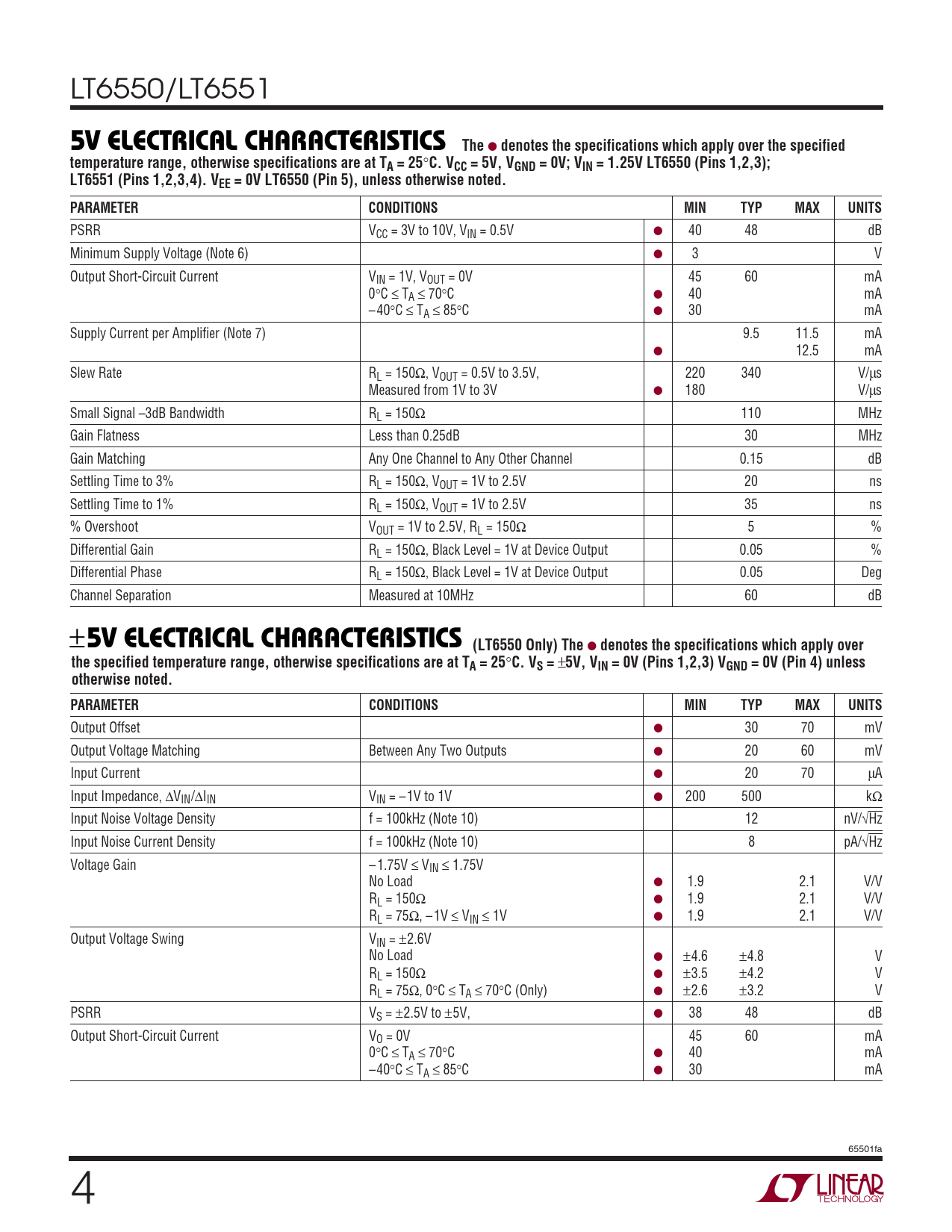 5V ELECTRICAL CHARACTERISTICS (LT6550 Only) The