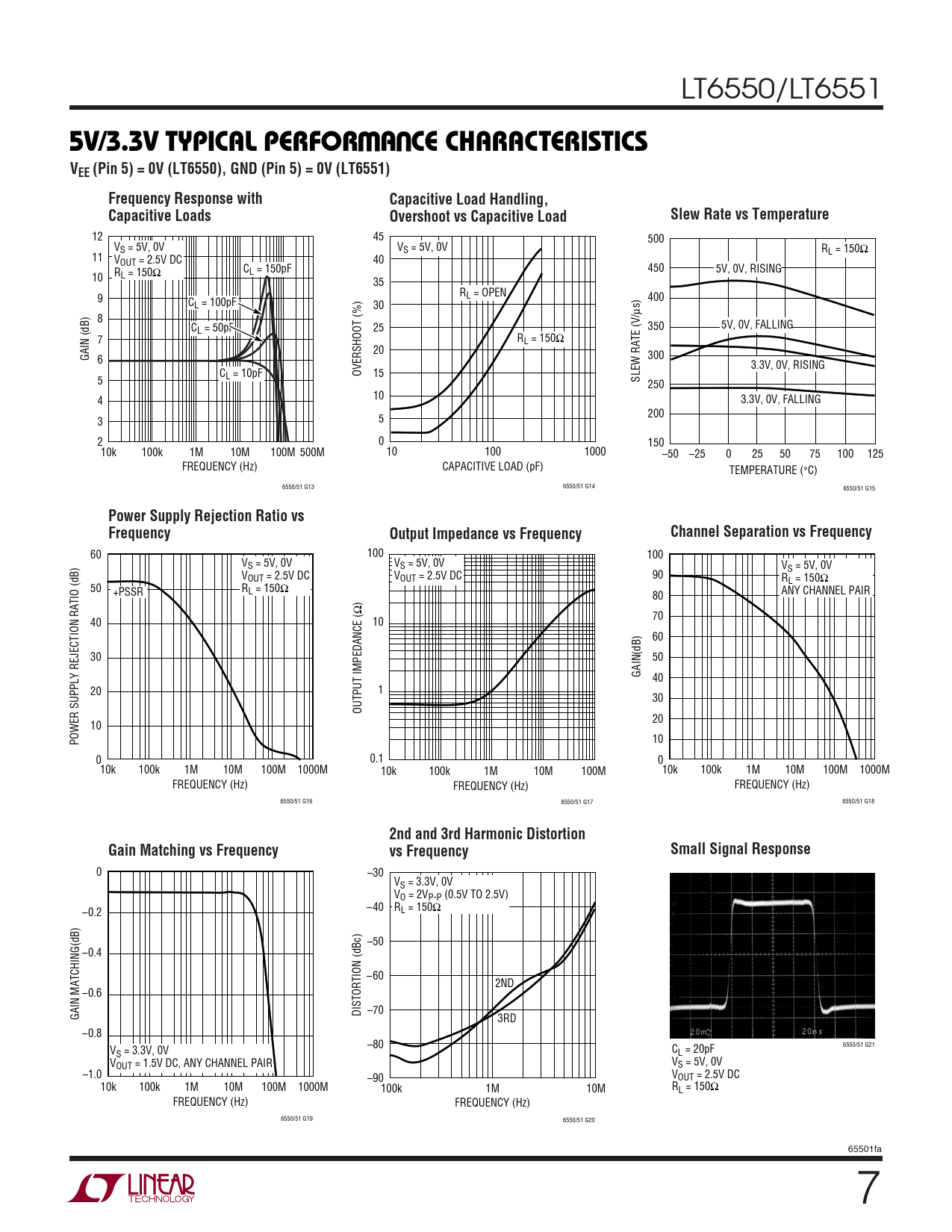 5V/3.3V TYPICAL PERFOR A CE CHARACTERISTICS. VEE (Pin 5) = 0V (LT6550), GND (Pin 5) = 0V (LT6551). Frequency Response with
