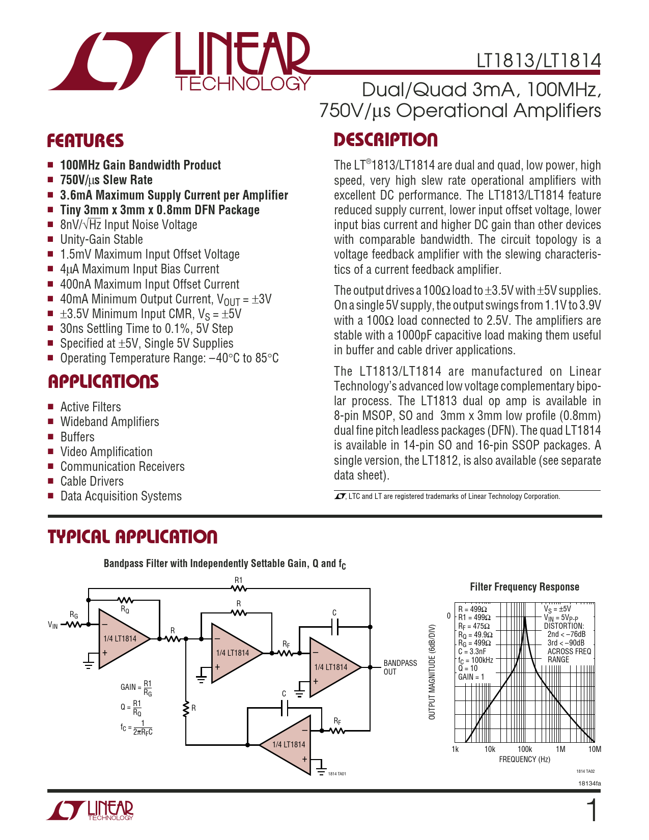 LT1813/LT1814 Dual/Quad 3mA, 100MHz, 750V/µs Operational Amplifiers UFEATURESDESCRIPTIO ■ 100MHz Gain Bandwidth Product The LT®1813/LT1814 are dual and quad, low power, high ■ 750V/ µ s Slew Rate speed, very high slew rate operational amplifiers with ■ 3.6mA Maximum Supply Current per Amplifier excellent DC performance. The LT1813/LT1814 feature ■ Tiny 3mm x 3mm x 0.8mm DFN Package reduced supply current, lower input offset voltage, lower ■ 8nV/√Hz Input Noise Voltage input bias current and higher DC gain than other devices ■ Unity-Gain Stable with comparable bandwidth. The circuit topology is a ■ 1.5mV Maximum Input Offset Voltage voltage feedback amplifier with the slewing characteris- ■ 4µA Maximum Input Bias Current tics of a current feedback amplifier. ■ 400nA Maximum Input Offset Current The output drives a 100Ω load to ±3.5V with ±5V supplies. ■ 40mA Minimum Output Current, VOUT = ±3V On a single 5V supply, the output swings from 1.1V to 3.9V ■ ±3.5V Minimum Input CMR, VS = ±5V with a 100Ω load connected to 2.5V. The amplifiers are ■ 30ns Settling Time to 0.1%, 5V Step stable with a 1000pF capacitive load making them useful ■ Specified at ±5V, Single 5V Supplies in buffer and cable driver applications. ■ Operating Temperature Range: –40°C to 85°C U The LT1813/LT1814 are manufactured on Linear APPLICATIO S Technology’s advanced low voltage complementary bipo- lar process. The LT1813 dual op amp is available in ■ Active Filters 8-pin MSOP, SO and 3mm x 3mm low profile (0.8mm) ■ Wideband Amplifiers dual fine pitch leadless packages (DFN). The quad LT1814 ■ Buffers is available in 14-pin SO and 16-pin SSOP packages. A ■ Video Amplification single version, the LT1812, is also available (see separate ■ Communication Receivers data sheet). ■ Cable Drivers ■ Data Acquisition Systems , LTC and LT are registered trademarks of Linear Technology Corporation. UTYPICAL APPLICATIOBandpass Filter with Independently Settable Gain, Q and fC R1 Filter Frequency Response R R R = 499Ω V R Q C S = ±5V G – 0 R1 = 499Ω VIN = 5VP-P VIN R DISTORTION: R – F = 475Ω R 2nd < –76dB 1/4 LT1814 Q = 49.9Ω + RF – RG = 499Ω 3rd < –90dB 1/4 LT1814 C = 3.3nF ACROSS FREQ + RANGE BANDPASS fC = 100kHz 1/4 LT1814 Q = 10 + OUT GAIN = 1 R1 GAIN = RG C R1 Q = R RQ R OUTPUT MAGNITUDE (6dB/DIV) 1 F – fC = 2πRFC 1/4 LT1814 + 1k 10k 100k 1M 10M FREQUENCY (Hz) 1814 TA02 1814 TA01 18134fa 1