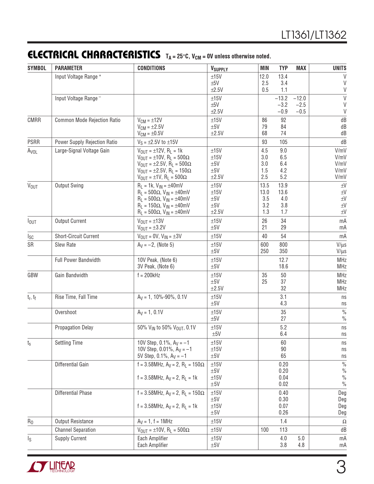 Input Voltage Range + ±15V 12.0 13.4 V ±5V 2.5 3.4 V ±2.5V 0.5 1.1 V Input Voltage Range – ±15V –13.2 –12.0 V ±5V –3.2 –2.5 V ±2.5V –0.9 –0.5 V CMRR Common Mode Rejection Ratio VCM = ±12V ±15V 86 92 dB VCM = ±2.5V ±5V 79 84 dB VCM = ±0.5V ±2.5V 68 74 dB PSRR Power Supply Rejection Ratio VS = ±2.5V to ±15V 93 105 dB AVOL Large-Signal Voltage Gain VOUT = ±12V, RL = 1k ±15V 4.5 9.0 V/mV VOUT = ±10V, RL = 500Ω ±15V 3.0 6.5 V/mV VOUT = ±2.5V, RL = 500Ω ±5V 3.0 6.4 V/mV VOUT = ±2.5V, RL = 150Ω ±5V 1.5 4.2 V/mV VOUT = ±1V, RL = 500Ω ±2.5V 2.5 5.2 V/mV VOUT Output Swing RL = 1k, VIN = ±40mV ±15V 13.5 13.9 ±V RL = 500Ω, VIN = ±40mV ±15V 13.0 13.6 ±V RL = 500Ω, VIN = ±40mV ±5V 3.5 4.0 ±V RL = 150Ω, VIN = ±40mV ±5V 3.2 3.8 ±V RL = 500Ω, VIN = ±40mV ±2.5V 1.3 1.7 ±V IOUT Output Current VOUT = ±13V ±15V 26 34 mA VOUT = ±3.2V ±5V 21 29 mA ISC Short-Circuit Current VOUT = 0V, VIN = ±3V ±15V 40 54 mA SR Slew Rate AV = – 2, (Note 5) ±15V 600 800 V/µs ±5V 250 350 V/µs Full Power Bandwidth 10V Peak, (Note 6) ±15V 12.7 MHz 3V Peak, (Note 6) ±5V 18.6 MHz GBW Gain Bandwidth f = 200kHz ±15V 35 50 MHz ±5V 25 37 MHz ±2.5V 32 MHz tr, tf Rise Time, Fall Time AV = 1, 10%-90%, 0.1V ±15V 3.1 ns ±5V 4.3 ns Overshoot AV = 1, 0.1V ±15V 35 % ±5V 27 % Propagation Delay 50% VIN to 50% VOUT, 0.1V ±15V 5.2 ns ±5V 6.4 ns ts Settling Time 10V Step, 0.1%, AV = –1 ±15V 60 ns 10V Step, 0.01%, AV = –1 ±15V 90 ns 5V Step, 0.1%, AV = –1 ±5V 65 ns Differential Gain f = 3.58MHz, AV = 2, RL = 150Ω ±15V 0.20 % ±5V 0.20 % f = 3.58MHz, AV = 2, RL = 1k ±15V 0.04 % ±5V 0.02 % Differential Phase f = 3.58MHz, AV = 2, RL = 150Ω ±15V 0.40 Deg ±5V 0.30 Deg f = 3.58MHz, AV = 2, RL = 1k ±15V 0.07 Deg ±5V 0.26 Deg RO Output Resistance AV = 1, f = 1MHz ±15V 1.4 Ω Channel Separation VOUT = ±10V, RL = 500Ω ±15V 100 113 dB IS Supply Current Each Amplifier ±15V 4.0 5.0 mA Each Amplifier ±5V 3.8 4.8 mA 3