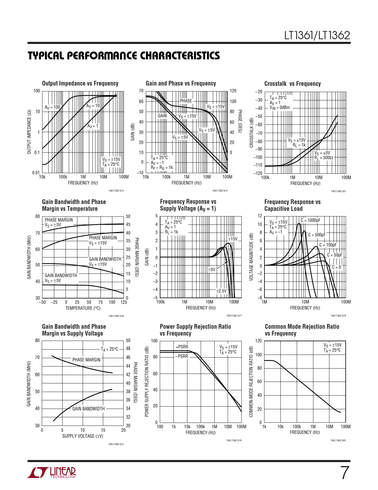 100 70 120 – 20 T – 30 A = 25°C 60 PHASE 100 AV = 1 A VS = ±15V PHASE (DEG) V ) V = 100 AV = 10 – 40 IN = 0dBm Ω 10 50 80 GAIN VS = ±15V – 50 40 60 A – 60 V = 1 V 1 30 S = ±5V 40 –70 GAIN (dB) VS = ±5V 20 20 – 80 VS = ±15V CROSSTALK (dB) RL = 1k – 90 OUTPUT IMPEDANCE ( 0.1 10 0 VS = ±5V V T –100 A = 25°C R S = ±15V L = 500Ω T 0 A A = 25°C V = –1 –110 RF = RG = 1k 0.01 –10 –120 10k 100k 1M 10M 100M 10k 100k 1M 10M 100M 100k 1M 10M 100M FREQUENCY (Hz) FREQUENCY (Hz) FREQUENCY (Hz) 1361/1362 G13 1361/1362 G14 1361/1362 G21