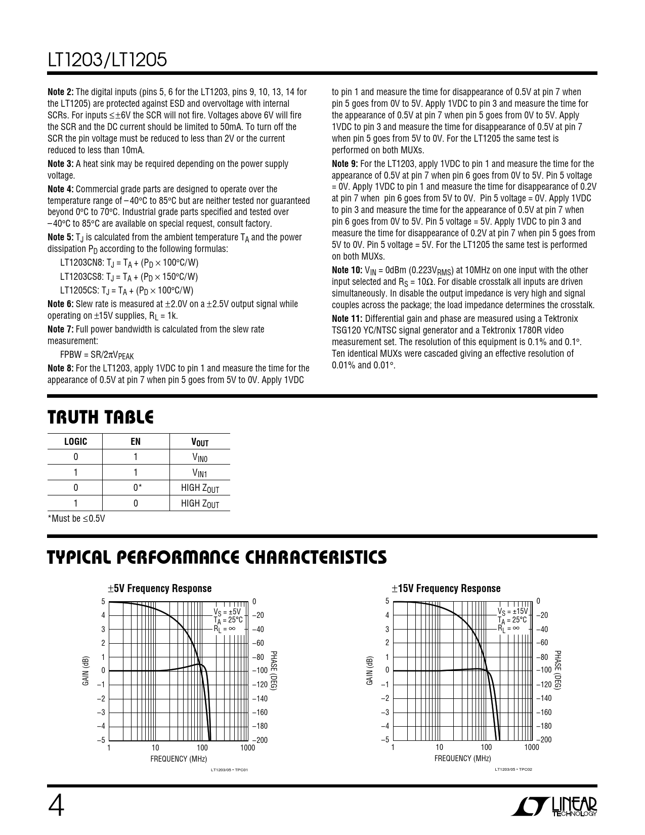 T measure the time for disappearance of 0.2V at pin 7 when pin 5 goes from J is calculated from the ambient temperature TA and the power dissipation P 5V to 0V. Pin 5 voltage = 5V. For the LT1205 the same test is performed D according to the following formulas: on both MUXs. LT1203CN8: TJ = TA + (PD × 100°C/W)