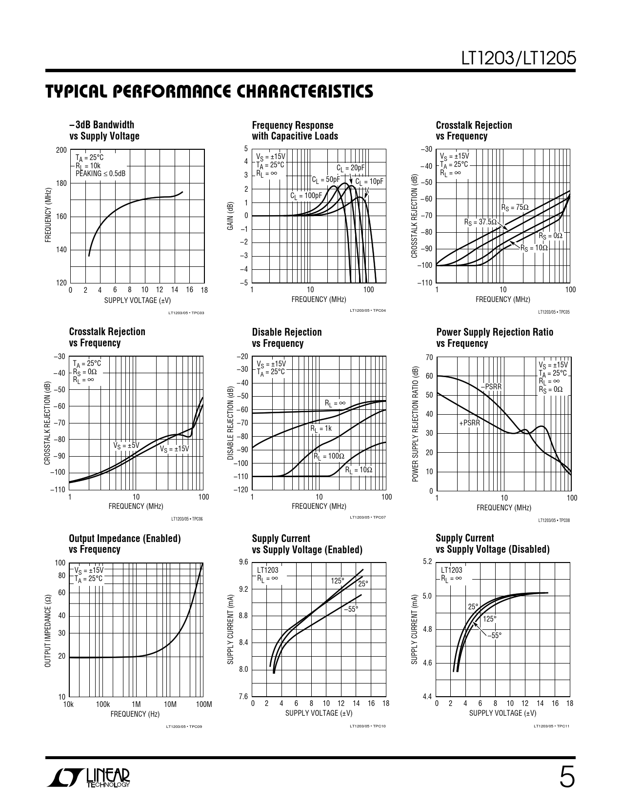 –30 –20 70 TA = 25°C V V –30 S = ±15V S = ±15V – 40 RS = 0Ω TA = 25°C 60 TA = 25°C RL = ∞ – 40 RL = ∞ –50 –PSRR RS = 0Ω –50 50 R – 60 L = ∞ – 60 40 –70 –70 +PSRR RL = 1k 30 –80 –80 VS = ±5V VS = ±15V –90 20 – 90 DISABLE REJECTION (dB) RL = 100Ω CROSSTALK REJECTION (dB) –100 –100 RL = 10Ω 10 –110 POWER SUPPLY REJECTION RATIO (dB) –110 –120 0 1 10 100 1 10 100 1 10 100 FREQUENCY (MHz) FREQUENCY (MHz) FREQUENCY (MHz) LT1203/05 • TPC06 LT1203/05 • TPC07 LT1203/05 • TPC08