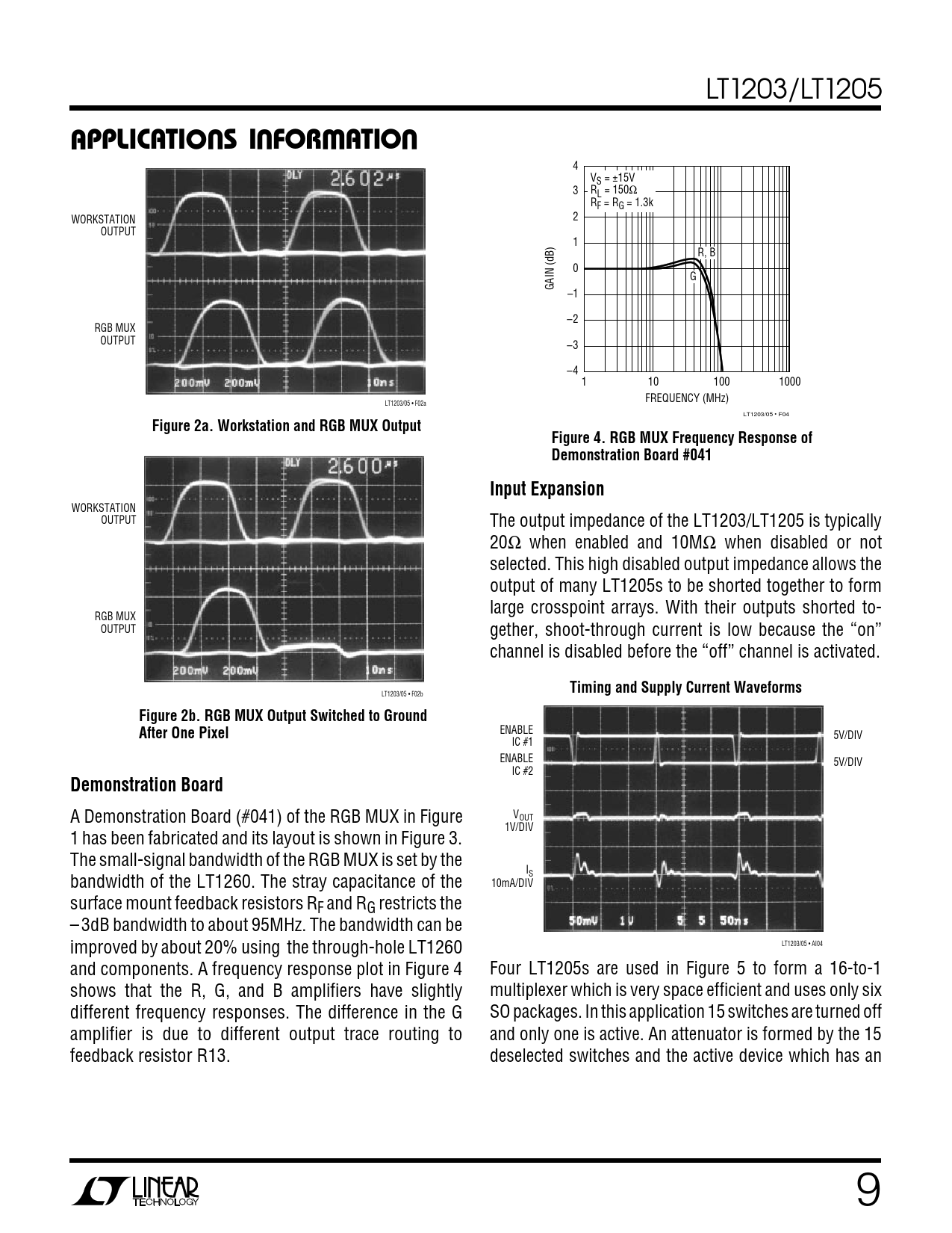 WORKSTATION OUTPUT The output impedance of the LT1203/LT1205 is typically 20Ω when enabled and 10MΩ when disabled or not selected. This high disabled output impedance allows the output of many LT1205s to be shorted together to form large crosspoint arrays. With their outputs shorted to- RGB MUX OUTPUT gether, shoot-through current is low because the “on” channel is disabled before the “off” channel is activated.