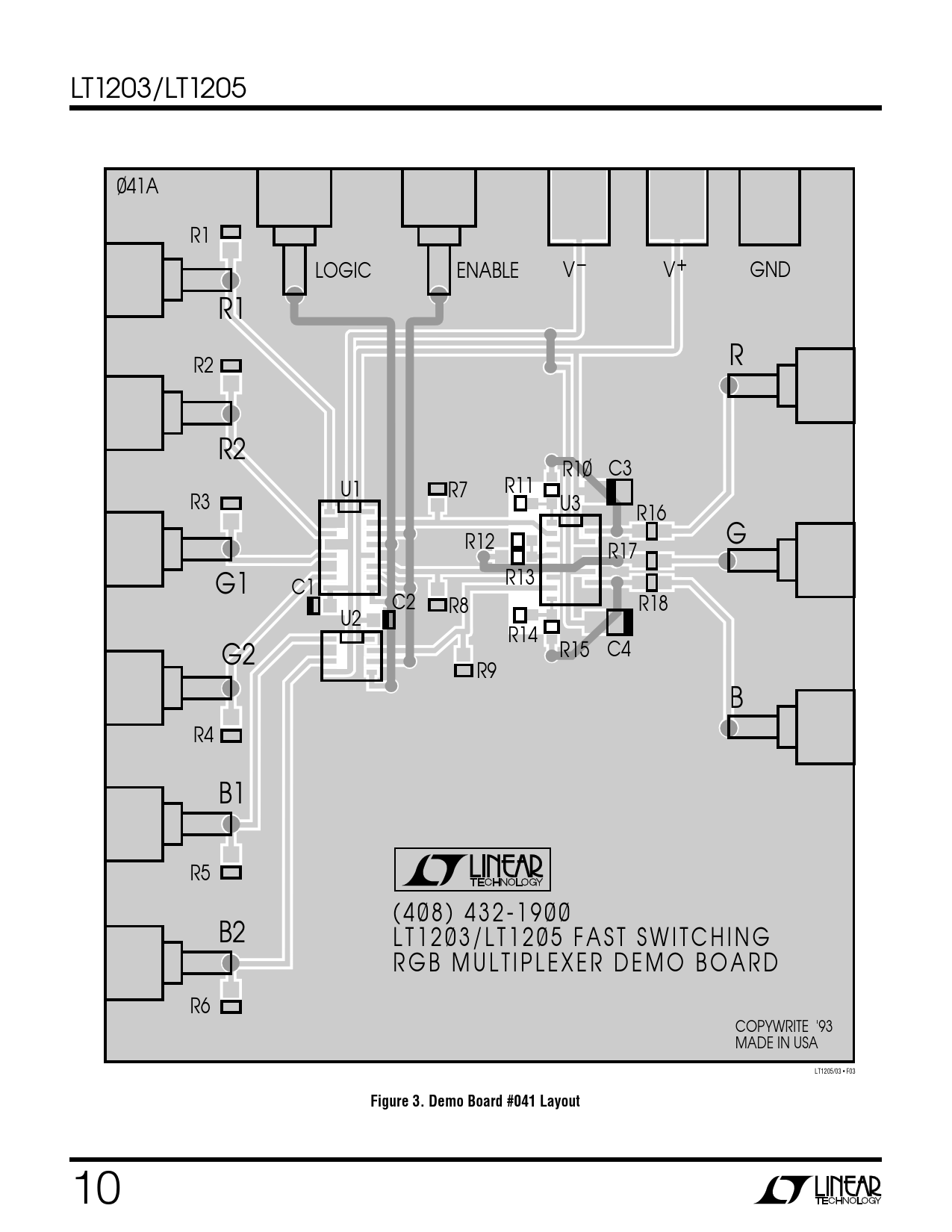 LT1203/LT1205 041A R1 LOGIC ENABLE V+ V – GND R1 R R2 R2 R10 C3 U1 R11 R7 R3 U3 R16 G R12 R17 G1 C1 R13 C2 R8 R18 U2 R14 R15 C4 G2 R9 B R4 B1 R5 ( 4 0 8 ) 4 3 2 - 1 9 0 0 B2 L T 1 2 0 3 / L T 1 2 0 5 F A S T S W I T C H I N G R G B M U L T I P L E X E R D E M O B O A R D R6 COPYWRITE '93 MADE IN USA LT1205/03 • F03