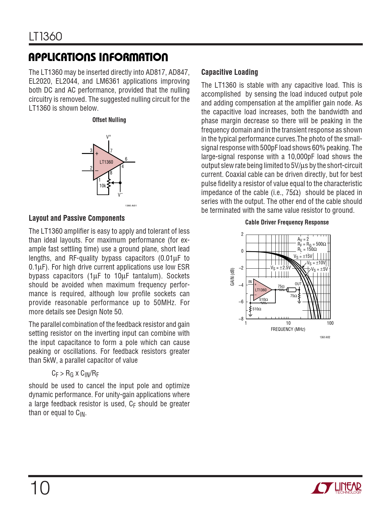 APPLICATIONS INFORMATION Capacitive Loading Offset Nulling Layout and Passive Components Cable Driver Frequency Response