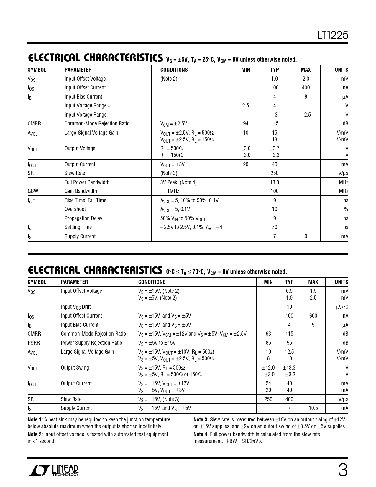 LT1225 ELECTRICAL CHAR CA TERISTICS VS = ± 5V, TA = 25 ° C, VCM = 0V unless otherwise noted.SYMBOLPARAMETERCONDITIONSMINTYPMAXUNITS VOS Input Offset Voltage (Note 2) 1.0 2.0 mV IOS Input Offset Current 100 400 nA IB Input Bias Current 4 8 µA Input Voltage Range + 2.5 4 V Input Voltage Range – – 3 – 2.5 V CMRR Common-Mode Rejection Ratio VCM = ±2.5V 94 115 dB AVOL Large-Signal Voltage Gain VOUT = ±2.5V, RL = 500Ω 10 15 V/mV VOUT = ±2.5V, RL = 150Ω 13 V/mV VOUT Output Voltage RL = 500Ω ±3.0 ±3.7 V RL = 150Ω ±3.0 ±3.3 V IOUT Output Current VOUT = ±3V 20 40 mA SR Slew Rate (Note 3) 250 V/µs Full Power Bandwidth 3V Peak, (Note 4) 13.3 MHz GBW Gain Bandwidth f = 1MHz 100 MHz tr, tf Rise Time, Fall Time AVCL = 5, 10% to 90%, 0.1V 9 ns Overshoot AVCL = 5, 0.1V 10 % Propagation Delay 50% VIN to 50% VOUT 9 ns ts Settling Time – 2.5V to 2.5V, 0.1%, AV = – 4 70 ns IS Supply Current 7 9 mA ELECTRICAL CHAR CA TERISTICS 0 ° C ≤ TA ≤ 70 ° C, VCM = 0V unless otherwise noted.SYMBOLPARAMETERCONDITIONSMINTYPMAXUNITS VOS Input Offset Voltage VS = ±15V, (Note 2) 0.5 1.5 mV VS = ±5V, (Note 2) 1.0 2.5 mV Input VOS Drift 10 µV/°C IOS Input Offset Current VS = ±15V and VS = ± 5V 100 600 nA IB Input Bias Current VS = ±15V and VS = ± 5V 4 9 µA CMRR Common-Mode Rejection Ratio VS = ±15V, VCM = ±12V and VS = ± 5V, VCM = ± 2.5V 93 115 dB PSRR Power Supply Rejection Ratio VS = ±5V to ±15V 85 95 dB AVOL Large Signal Voltage Gain VS = ±15V, VOUT = ±10V, RL = 500Ω 10 12.5 V/mV VS = ±5V, VOUT = ±2.5V, RL = 500Ω 8 10 V/mV VOUT Output Swing VS = ±15V, RL = 500Ω ±12.0 ±13.3 V VS = ±5V, RL = 500Ω or 150Ω ±3.0 ±3.3 V IOUT Output Current VS = ±15V, VOUT = ±12V 24 40 mA VS = ±5V, VOUT = ±3V 20 40 mA SR Slew Rate VS = ±15V, (Note 3) 250 400 V/µs IS Supply Current VS = ±15V and VS = ± 5V 7 10.5 mA Note 1: A heat sink may be required to keep the junction temperature Note 3: Slew rate is measured between ±10V on an output swing of ±12V below absolute maximum when the output is shorted indefinitely. on ±15V supplies, and ±2V on an output swing of ±3.5V on ±5V supplies. Note 2: Input offset voltage is tested with automated test equipment Note 4: Full power bandwidth is calculated from the slew rate in <1 second. measurement: FPBW = SR/2πVp. 3