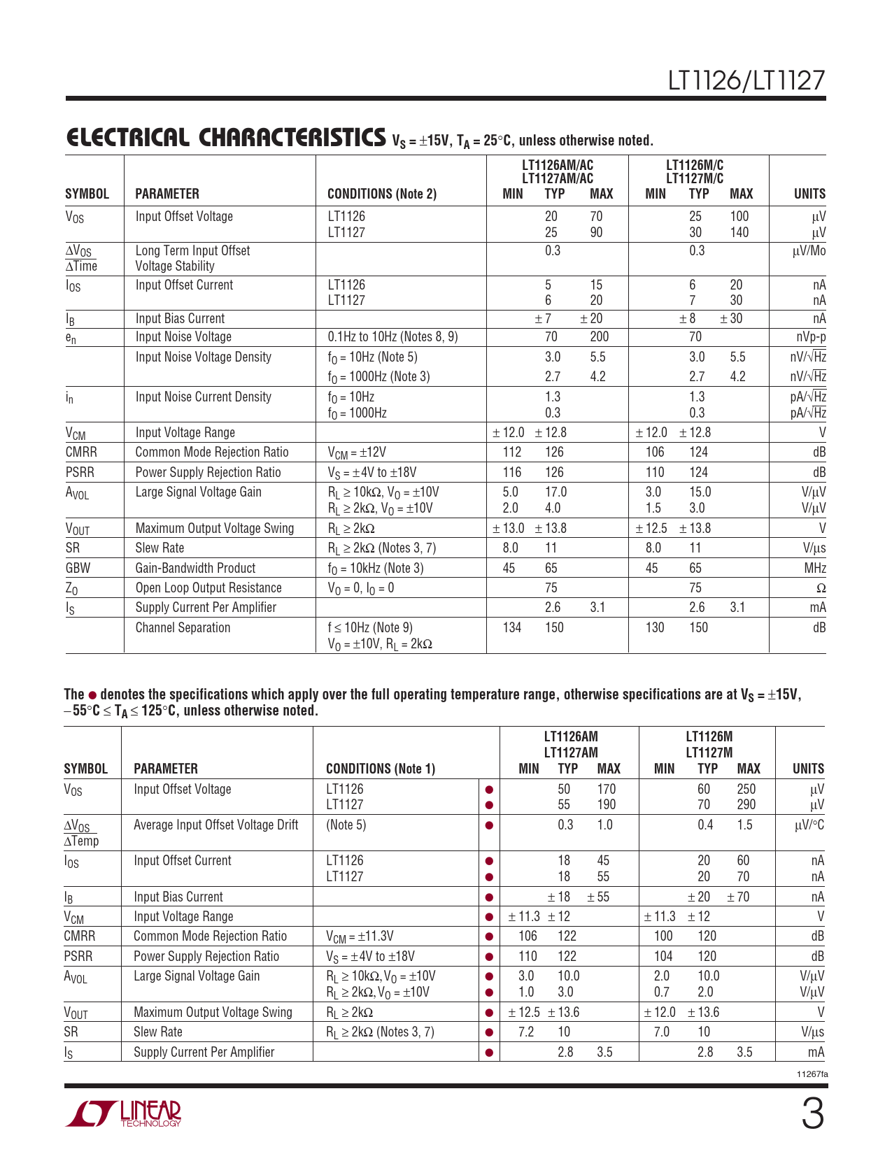 ELECTRICAL CH. ARA TERISTICS VS =. 15V, TA = 25. C, unless otherwise noted. LT1126AM/AC. LT1126M/C. LT1127AM/AC. LT1127M/C. SYMBOL