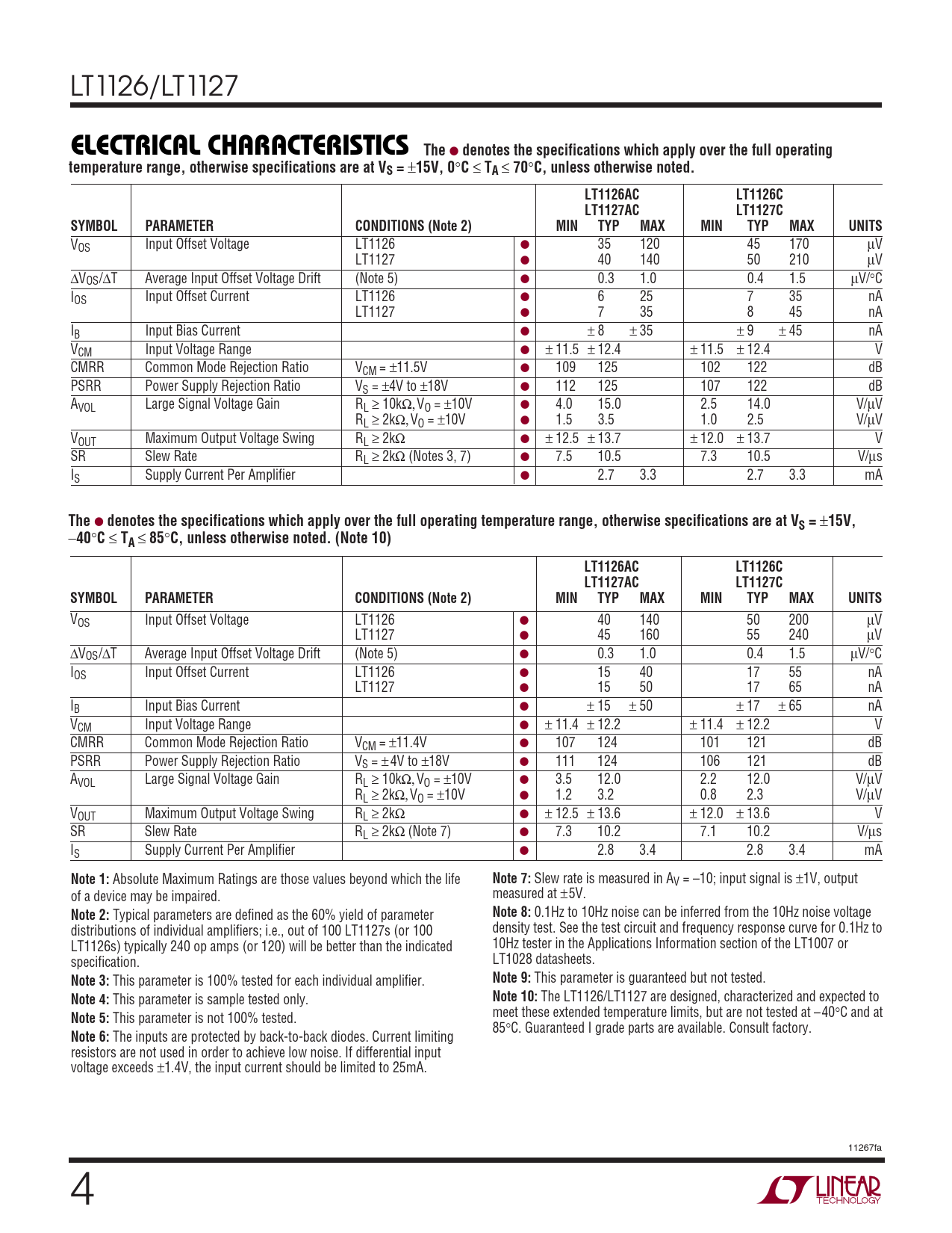 C, unless otherwise noted. (Note 10) LT1126AC LT1126C LT1127AC LT1127C SYMBOL PARAMETER CONDITIONS (Note 2) MIN TYP MAX MIN TYP MAX UNITS