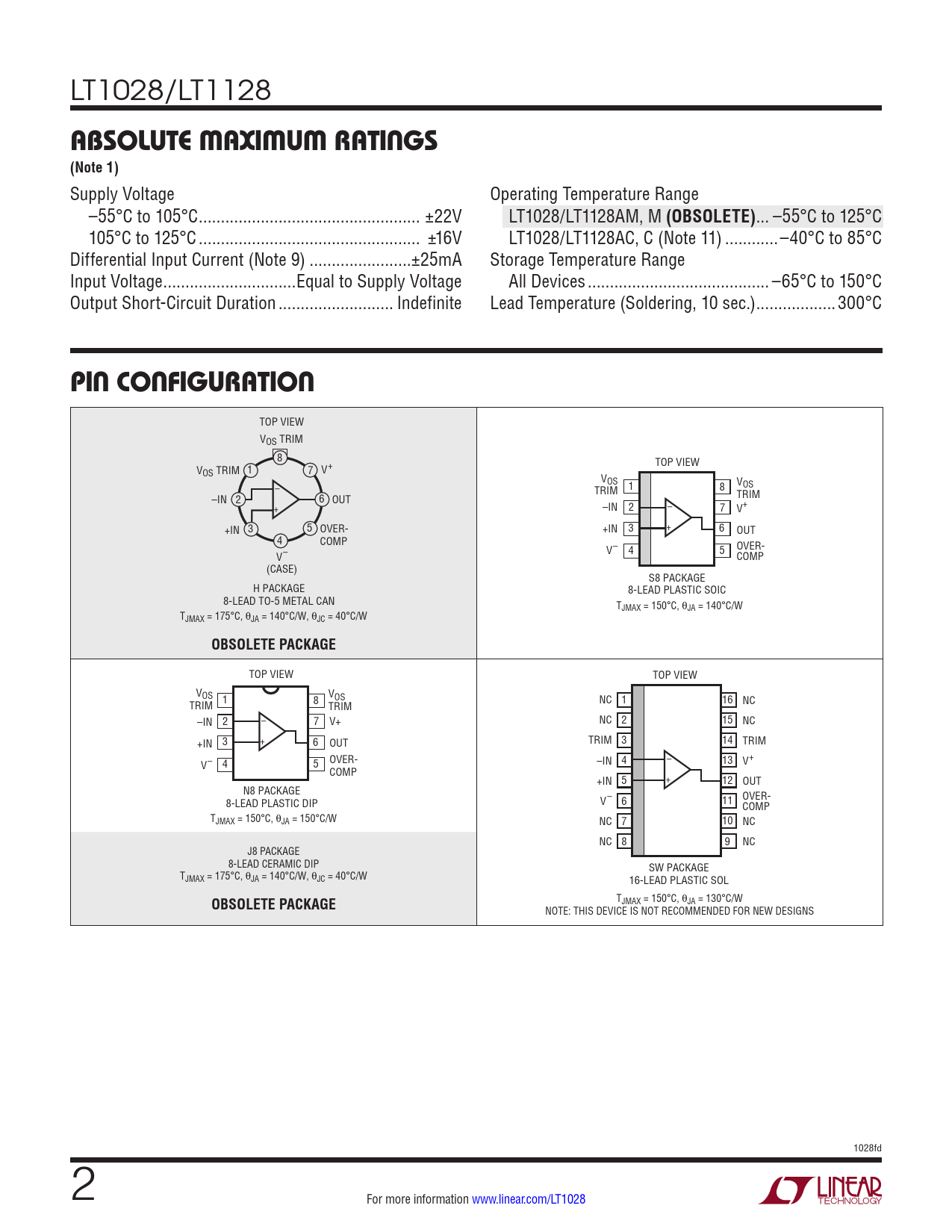 LT1028/LT1128 ABSOLUTE MAXIMUM RATINGS (Note 1) Supply Voltage Operating Temperature Range –55°C to 105°C .. ±22V LT1028/LT1128AM, M (OBSOLETE) ... –55°C to 125°C 105°C to 125°C .. ±16V LT1028/LT1128AC, C (Note 11) ..–40°C to 85°C Differential Input Current (Note 9) ...±25mA Storage Temperature Range Input Voltage ..Equal to Supply Voltage Al Devices ... –65°C to 150°C Output Short-Circuit Duration .. Indefinite Lead Temperature (Soldering, 10 sec.) ..300°C PIN CONFIGURATION TOP VIEW VOS TRIM 8 TOP VIEW V 1 OS TRIM 7 V+ VOS V – 1 8 TRIM OS –IN 2 6 OUT TRIM + –IN 2 – 7 V+ +IN 3 5 OVER- +IN 3 + 6 OUT 4 COMP OVER- V– V– 4 5 COMP (CASE) S8 PACKAGE H PACKAGE 8-LEAD PLASTIC SOIC 8-LEAD TO-5 METAL CAN TJMAX = 150°C, θJA = 140°C/W TJMAX = 175°C, θJA = 140°C/W, θJC = 40°C/W OBSOLETE PACKAGE TOP VIEW TOP VIEW VOS 1 8 VOS TRIM NC 16 TRIM 1 NC –IN 2 – 7 V+ NC 2 15 NC +IN 3 + 6 OUT TRIM 3 14 TRIM V– 4 5 OVER- –IN 4 – 13 V+ COMP +IN 5 + 12 OUT N8 PACKAGE OVER- 8-LEAD PLASTIC DIP V– 6 11 COMP TJMAX = 150°C, θJA = 150°C/W NC 7 10 NC NC 8 9 NC J8 PACKAGE 8-LEAD CERAMIC DIP SW PACKAGE TJMAX = 175°C, θJA = 140°C/W, θJC = 40°C/W 16-LEAD PLASTIC SOL TJMAX = 150°C, θJA = 130°C/W OBSOLETE PACKAGE NOTE: THIS DEVICE IS NOT RECOMMENDED FOR NEW DESIGNS 1028fd 2 For more information www.linear.com/LT1028 Document Outline Features Applications Description Typical Application Absolute Maximum Ratings Pin Configuration Order Information Electrical Characteristics Typical Performance Characteristics Applications Information - Noise Applications Information Typical Applications Schematic Diagram Package Description Revision History Typical Application Related Parts