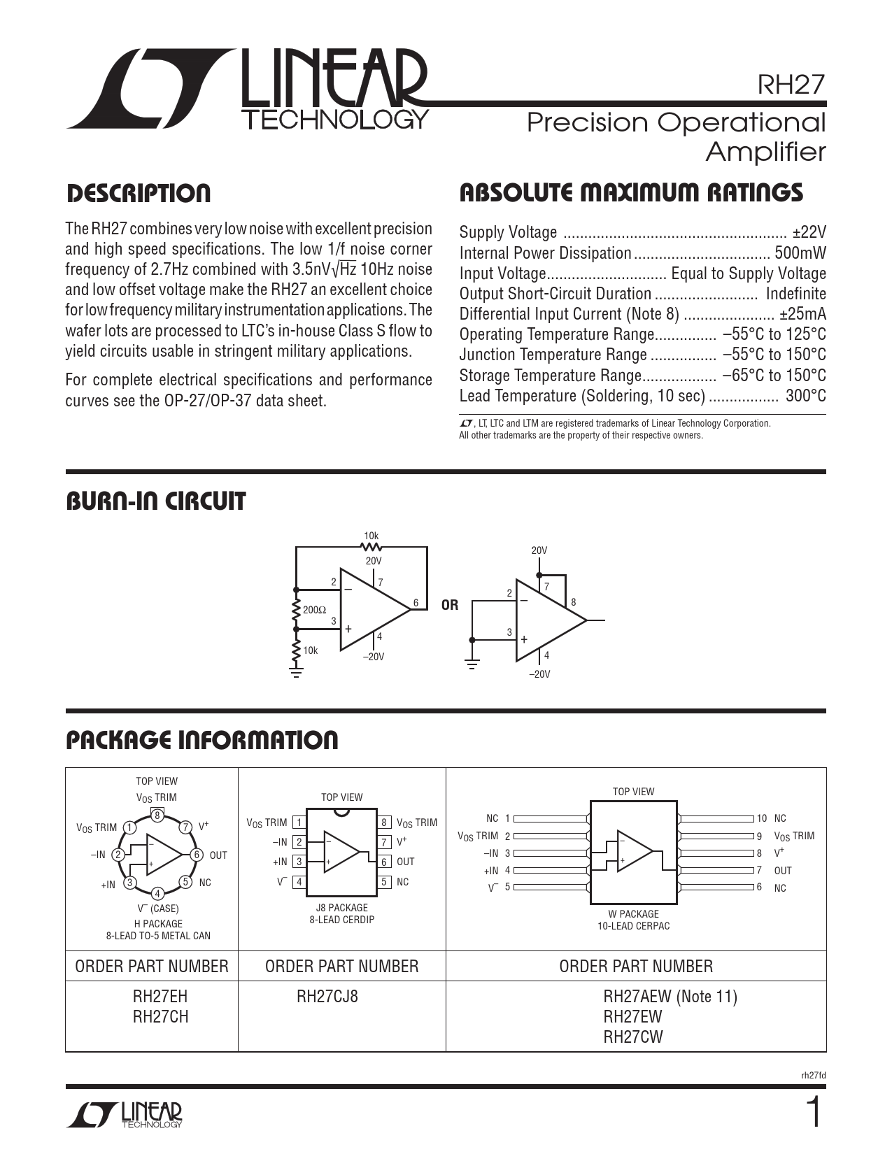 TOP VIEW TOP VIEW VOS TRIM TOP VIEW 8 V NC 1 10 NC OS TRIM 1 V V 1 7 V+ 8 OS TRIM OS TRIM – – VOS TRIM 2 – 9 V –IN 2 7 V+ OS TRIM –IN 2 6 OUT –IN 3 + 8 V+ + + +IN 3 6 OUT +IN 4 7 OUT +IN 3 5 NC V– 4 5 NC V– 5 6 NC 4 V– (CASE) J8 PACKAGE W PACKAGE H PACKAGE 8-LEAD CERDIP 10-LEAD CERPAC 8-LEAD TO-5 METAL CAN ORDER PART NUMBER ORDER PART NUMBER ORDER PART NUMBER RH27EH RH27CJ8 RH27AEW (Note 11) RH27CH RH27EW RH27CW rh27fd 1