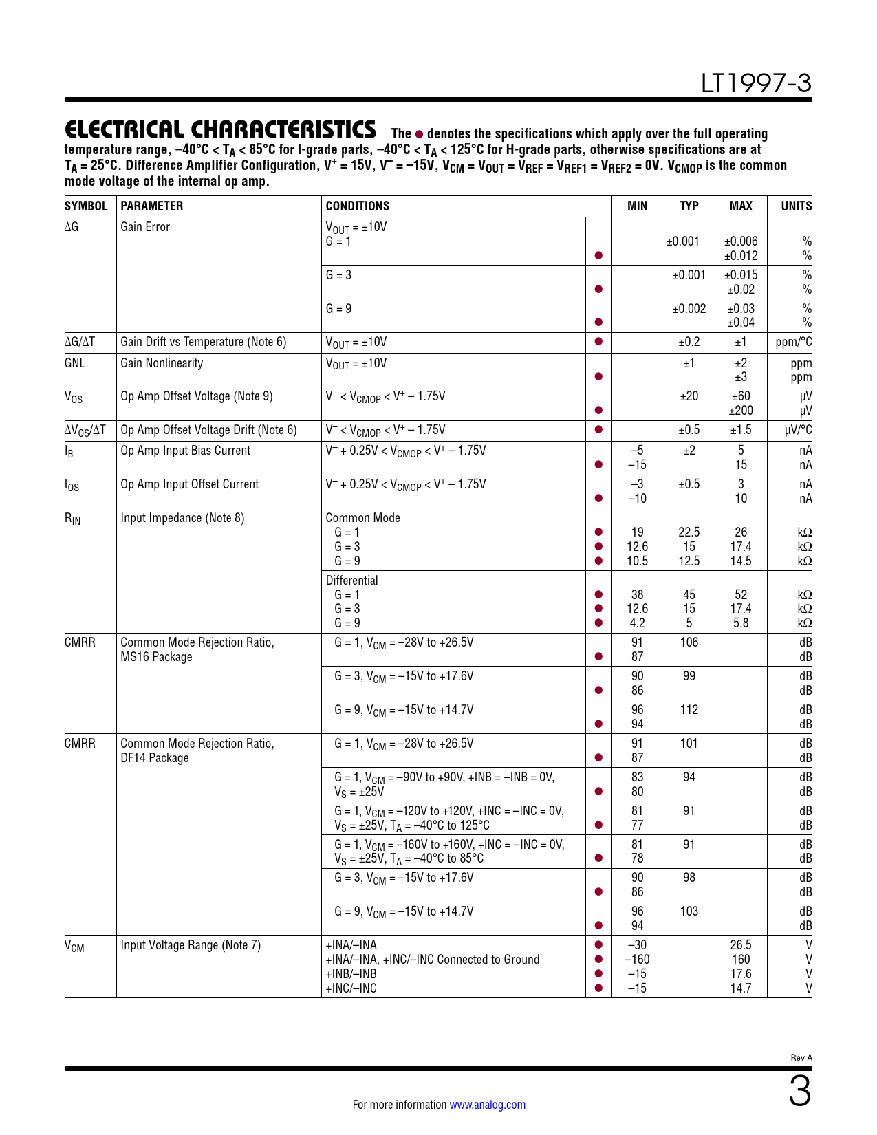 LT1997-3 ELECTRICAL CHARACTERISTICSThe l denotes the specifications which apply over the full operatingtemperature range, –40°C < TA < 85°C for I-grade parts, –40°C < TA < 125°C for H-grade parts, otherwise specifications are atTA = 25°C. Difference Amplifier Configuration, V+ = 15V, V– = –15V, VCM = VOUT = VREF = VREF1 = VREF2 = 0V. VCMOP is the commonmode voltage of the internal op amp. SYMBOL PARAMETERCONDITIONSMINTYPMAXUNITS ∆G Gain Error VOUT = ±10V G = 1 ±0.001 ±0.006 % l ±0.012 % G = 3 ±0.001 ±0.015 % l ±0.02 % G = 9 ±0.002 ±0.03 % l ±0.04 % ∆G/∆T Gain Drift vs Temperature (Note 6) VOUT = ±10V l ±0.2 ±1 ppm/°C GNL Gain Nonlinearity VOUT = ±10V ±1 ±2 ppm l ±3 ppm VOS Op Amp Offset Voltage (Note 9) V– < VCMOP < V+ – 1.75V ±20 ±60 µV l ±200 µV ∆VOS/∆T Op Amp Offset Voltage Drift (Note 6) V– < VCMOP < V+ – 1.75V l ±0.5 ±1.5 µV/°C IB Op Amp Input Bias Current V– + 0.25V < VCMOP < V+ – 1.75V –5 ±2 5 nA l –15 15 nA IOS Op Amp Input Offset Current V– + 0.25V < VCMOP < V+ – 1.75V –3 ±0.5 3 nA l –10 10 nA RIN Input Impedance (Note 8) Common Mode G = 1 l 19 22.5 26 kΩ G = 3 l 12.6 15 17.4 kΩ G = 9 l 10.5 12.5 14.5 kΩ Differential G = 1 l 38 45 52 kΩ G = 3 l 12.6 15 17.4 kΩ G = 9 l 4.2 5 5.8 kΩ CMRR Common Mode Rejection Ratio, G = 1, VCM = –28V to +26.5V 91 106 dB MS16 Package l 87 dB G = 3, VCM = –15V to +17.6V 90 99 dB l 86 dB G = 9, VCM = –15V to +14.7V 96 112 dB l 94 dB CMRR Common Mode Rejection Ratio, G = 1, VCM = –28V to +26.5V 91 101 dB DF14 Package l 87 dB G = 1, VCM = –90V to +90V, +INB = –INB = 0V, 83 94 dB VS = ±25V l 80 dB G = 1, VCM = –120V to +120V, +INC = –INC = 0V, 81 91 dB VS = ±25V, TA = –40°C to 125°C l 77 dB G = 1, VCM = –160V to +160V, +INC = –INC = 0V, 81 91 dB VS = ±25V, TA = –40°C to 85°C l 78 dB G = 3, VCM = –15V to +17.6V 90 98 dB l 86 dB G = 9, VCM = –15V to +14.7V 96 103 dB l 94 dB VCM Input Voltage Range (Note 7) +INA/–INA l –30 26.5 V +INA/–INA, +INC/–INC Connected to Ground l –160 160 V +INB/–INB l –15 17.6 V +INC/–INC l –15 14.7 V Rev A For more information www.analog.com 3 Document Outline FEATURES DESCRIPTION APPLICATIONS TYPICAL APPLICATION ABSOLUTE MAXIMUM RATINGS PIN CONFIGURATION ORDER INFORMATION ELECTRICAL CHARACTERISTICS TYPICAL PERFORMANCE CHARACTERISTICS PIN FUNCTIONS BLOCK DIAGRAM APPLICATIONS INFORMATION TYPICAL APPLICATIONS PACKAGE DESCRIPTION REVISION HISTORY TYPICAL APPLICATION RELATED PARTS