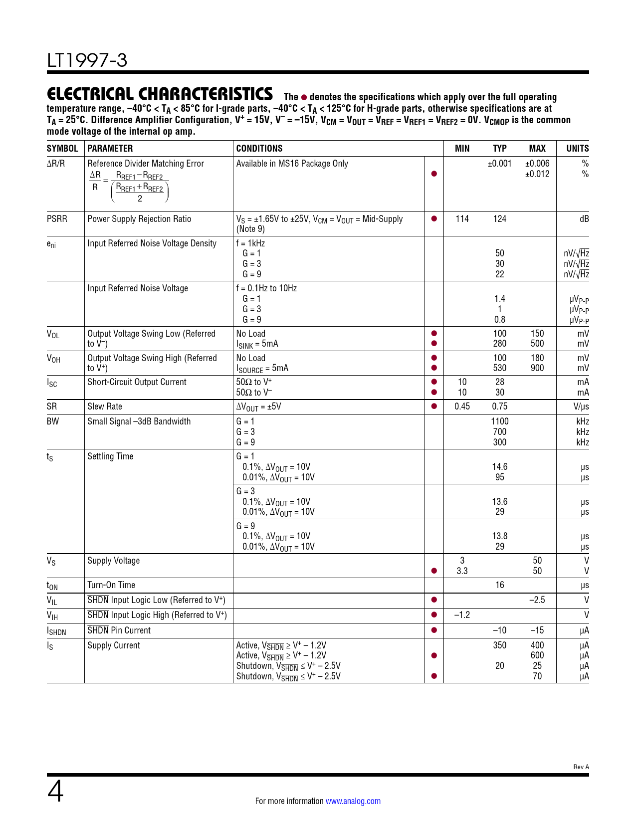 denotes the specifications which apply over the full operating temperature range, –40°C < TA < 85°C for I-grade parts, –40°C < TA < 125°C for H-grade parts, otherwise specifications are at TA = 25°C. Difference Amplifier Configuration, V+ = 15V, V– = –15V, VCM = VOUT = VREF = VREF1 = VREF2 = 0V. VCMOP is the common mode voltage of the internal op amp. SYMBOL PARAMETER CONDITIONS MIN TYP MAX UNITS