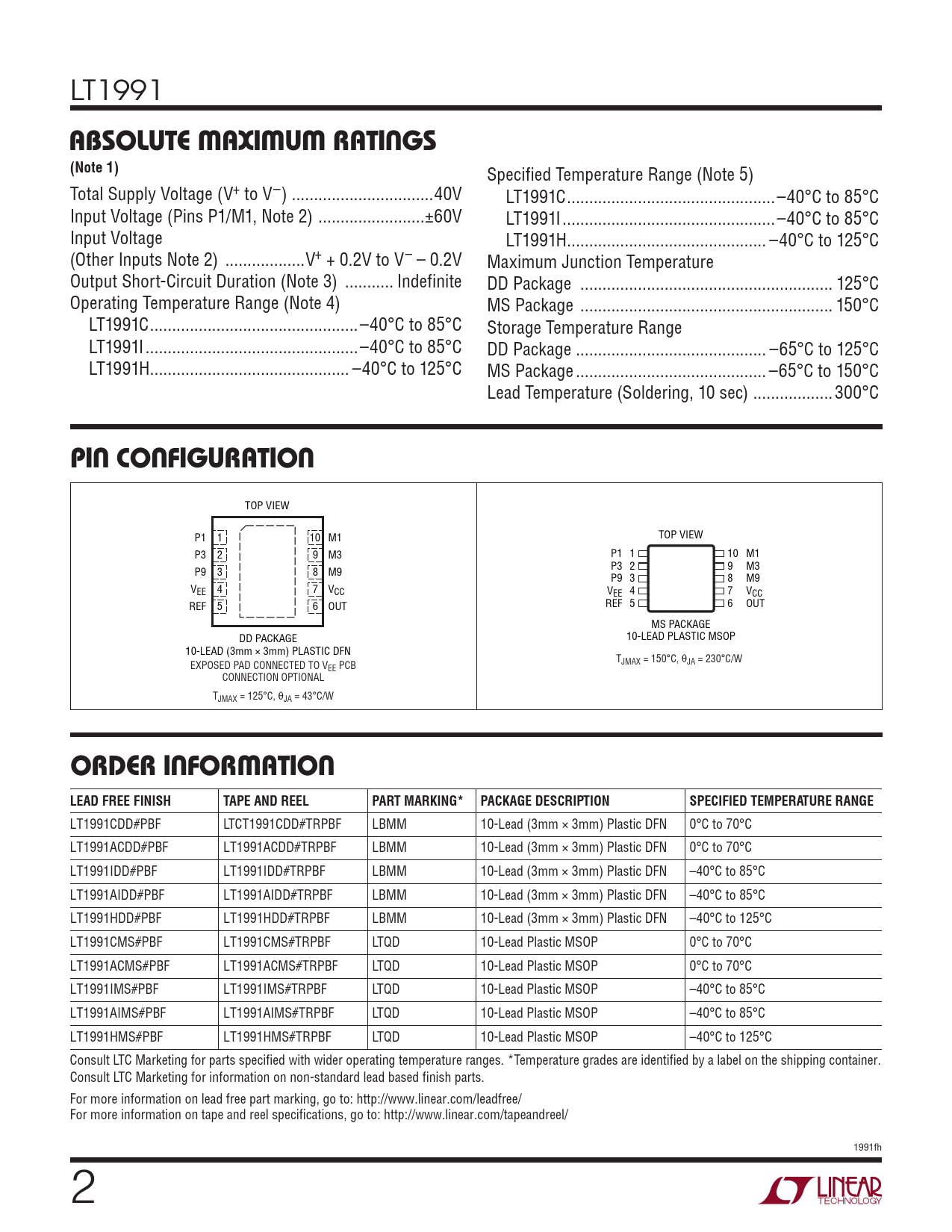 Specified Temperature Range (Note 5) Total Supply Voltage (V+ to V–) ..40V LT1991C ...–40°C to 85°C Input Voltage (Pins P1/M1, Note 2) ..±60V LT1991I ..–40°C to 85°C Input Voltage LT1991H ... –40°C to 125°C (Other Inputs Note 2) ..V+ + 0.2V to V– – 0.2V Maximum Junction Temperature Output Short-Circuit Duration (Note 3) ... Indefinite DD Package ... 125°C Operating Temperature Range (Note 4) MS Package ... 150°C LT1991C ...–40°C to 85°C Storage Temperature Range LT1991I ..–40°C to 85°C DD Package ... –65°C to 125°C LT1991H ... –40°C to 125°C MS Package ... –65°C to 150°C Lead Temperature (Soldering, 10 sec) ..300°C