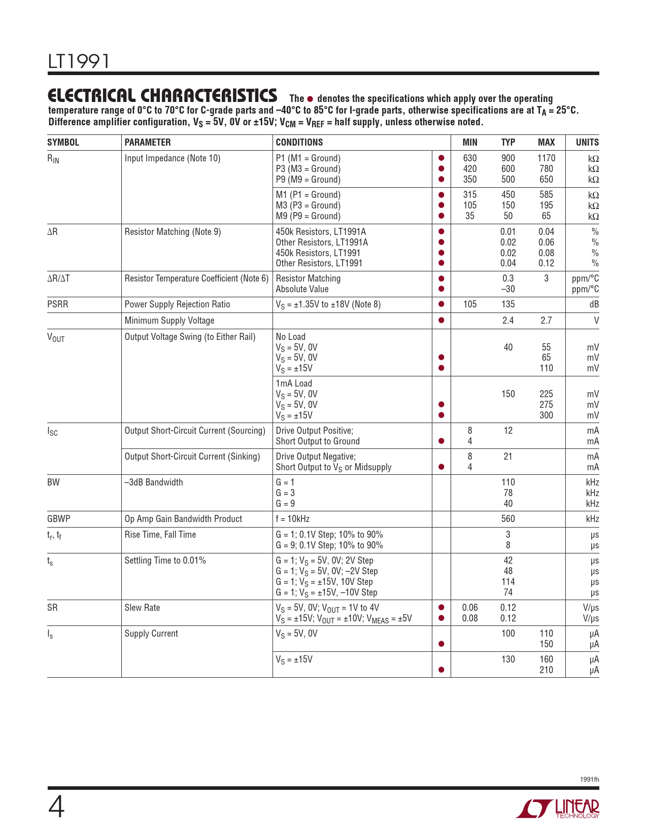 RIN Input Impedance (Note 10) P1 (M1 = Ground) l 630 900 1170 kΩ P3 (M3 = Ground) l 420 600 780 kΩ P9 (M9 = Ground) l 350 500 650 kΩ M1 (P1 = Ground) l 315 450 585 kΩ M3 (P3 = Ground) l 105 150 195 kΩ M9 (P9 = Ground) l 35 50 65 kΩ ∆R Resistor Matching (Note 9) 450k Resistors, LT1991A l 0.01 0.04 % Other Resistors, LT1991A l 0.02 0.06 % 450k Resistors, LT1991 l 0.02 0.08 % Other Resistors, LT1991 l 0.04 0.12 % ∆R/∆T Resistor Temperature Coefficient (Note 6) Resistor Matching l 0.3 3 ppm/°C Absolute Value l –30 ppm/°C PSRR Power Supply Rejection Ratio VS = ±1.35V to ±18V (Note 8) l 105 135 dB Minimum Supply Voltage l 2.4 2.7 V VOUT Output Voltage Swing (to Either Rail) No Load VS = 5V, 0V 40 55 mV VS = 5V, 0V l 65 mV VS = ±15V l 110 mV 1mA Load VS = 5V, 0V 150 225 mV VS = 5V, 0V l 275 mV VS = ±15V l 300 mV ISC Output Short-Circuit Current (Sourcing) Drive Output Positive; 8 12 mA Short Output to Ground l 4 mA Output Short-Circuit Current (Sinking) Drive Output Negative; 8 21 mA Short Output to VS or Midsupply l 4 mA BW –3dB Bandwidth G = 1 110 kHz G = 3 78 kHz G = 9 40 kHz GBWP Op Amp Gain Bandwidth Product f = 10kHz 560 kHz tr, tf Rise Time, Fall Time G = 1; 0.1V Step; 10% to 90% 3 µs G = 9; 0.1V Step; 10% to 90% 8 µs ts Settling Time to 0.01% G = 1; VS = 5V, 0V; 2V Step 42 µs G = 1; VS = 5V, 0V; –2V Step 48 µs G = 1; VS = ±15V, 10V Step 114 µs G = 1; VS = ±15V, –10V Step 74 µs SR Slew Rate VS = 5V, 0V; VOUT = 1V to 4V l 0.06 0.12 V/µs VS = ±15V; VOUT = ±10V; VMEAS = ±5V l 0.08 0.12 V/µs Is Supply Current VS = 5V, 0V 100 110 µA l 150 µA VS = ±15V 130 160 µA l 210 µA 1991fh 4 Document Outline Features Applications Description Typical Application Absolute Maximum Ratings Pin Configuration Order Information Electrical Characteristics Typical Performance Characteristics Pin Functions Block Diagram Applications Information Typical Applications Package Description Revision History Typical Application Related Parts