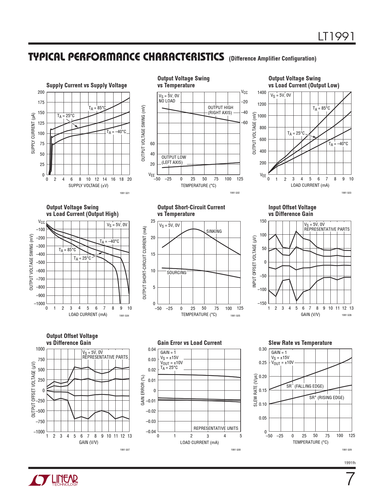 VCC 25 150 VS = 5V, 0V VS = 5V, 0V VS = 5V, 0V –100 SINKING REPRESENTATIVE PARTS 100 –200 20 TA = –40°C –300 T 50 A = 85°C –400 15 TA = 25°C –500 0 –600 10 SOURCING –50 –700 –800 OUTPUT VOLTAGE SWING (mV) 5 INPUT OFFSET VOLTAGE (µV) –100 –900 OUTPUT SHORT-CIRCUIT CURRENT (mA) –1000 0 –150 0 1 2 3 4 5 6 7 8 9 10 –50 –25 0 25 50 75 100 125 1 2 3 4 5 6 7 8 9 10 11 12 13 LOAD CURRENT (mA) 1991 G04 TEMPERATURE (°C) 1991 G05 GAIN (V/V) 1991 G06