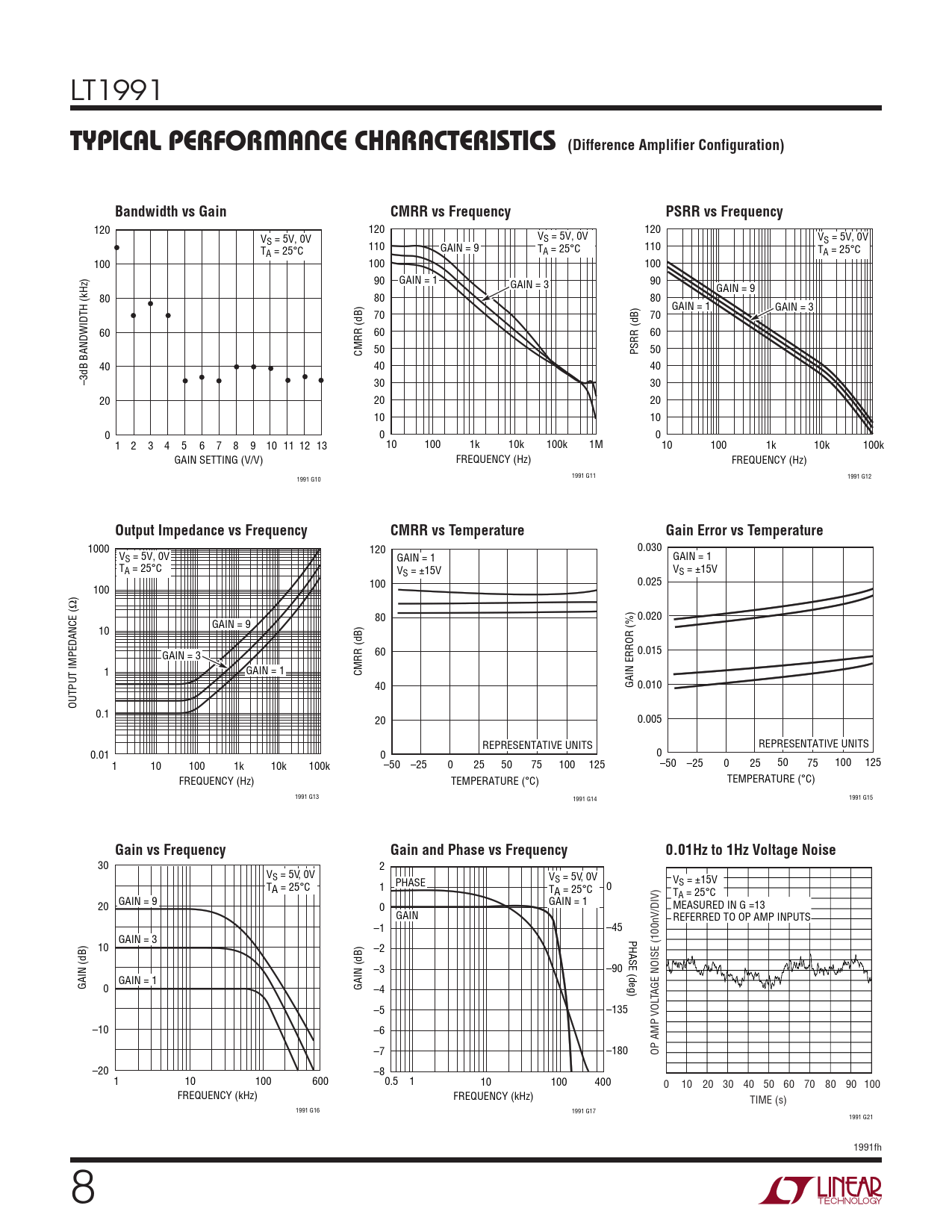 1000 0.030 V 120 S = 5V, 0V GAIN = 1 GAIN = 1 TA = 25°C VS = ±15V VS = ±15V 0.025 100 100 0.020 GAIN = 9 80 10 GAIN = 3 60 0.015 1 GAIN = 1 CMRR (dB) 40 GAIN ERROR (%) 0.010 OUTPUT IMPEDANCE (Ω) 0.1 20 0.005 REPRESENTATIVE UNITS REPRESENTATIVE UNITS 0.01 0 0 1 10 100 1k 10k 100k –50 –25 0 25 50 75 100 125 –50 –25 0 25 50 75 100 125 FREQUENCY (Hz) TEMPERATURE (°C) TEMPERATURE (°C) 1991 G13 1991 G14 1991 G15