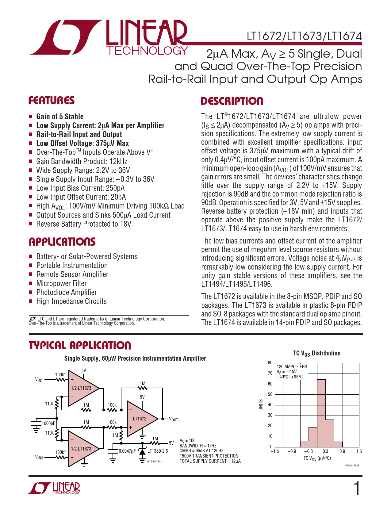 LT1672/LT1673/LT1674 2µA Max, AV ≥ 5 Single, Dual and Quad Over-The-Top Precision Rail-to-Rail Input and Output Op Amps UFEATURESDESCRIPTIO ■ Gain of 5 Stable The LT®1672/LT1673/LT1674 are ultralow power ■ Low Supply Current: 2 µ A Max per Amplifier (IS ≤ 2µA) decompensated (AV ≥ 5) op amps with preci- ■ Rail-to-Rail Input and Output sion specifications. The extremely low supply current is ■ Low Offset Voltage: 375 µ V Max combined with excellent amplifier specifications: input ■ Over-The-TopTM Inputs Operate Above V+ offset voltage is 375µV maximum with a typical drift of ■ Gain Bandwidth Product: 12kHz only 0.4µV/°C, input offset current is 100pA maximum. A ■ Wide Supply Range: 2.2V to 36V minimum open-loop gain (AVOL) of 100V/mV ensures that ■ Single Supply Input Range: – 0.3V to 36V gain errors are small. The devices’ characteristics change ■ Low Input Bias Current: 250pA little over the supply range of 2.2V to ±15V. Supply rejection is 90dB and the common mode rejection ratio is ■ Low Input Offset Current: 20pA 90dB. Operation is specified for 3V, 5V and ±15V supplies. ■ High AVOL: 100V/mV Minimum Driving 100kΩ Load Reverse battery protection (–18V min) and inputs that ■ Output Sources and Sinks 500µA Load Current operate above the positive supply make the LT1672/ ■ Reverse Battery Protected to 18V LT1673/LT1674 easy to use in harsh environments. UAPPLICATIO S The low bias currents and offset current of the amplifier permit the use of megohm level source resistors without ■ Battery- or Solar-Powered Systems introducing significant errors. Voltage noise at 4µVP-P is ■ Portable Instrumentation remarkably low considering the low supply current. For ■ Remote Sensor Amplifier unity gain stable versions of these amplifiers, see the ■ Micropower Filter LT1494/LT1495/LT1496. ■ Photodiode Amplifier The LT1672 is available in the 8-pin MSOP, PDIP and SO ■ High Impedance Circuits packages. The LT1673 is available in plastic 8-pin PDIP and SO-8 packages with the standard dual op amp pinout. , LTC and LT are registered trademarks of Linear Technology Corporation. Over-The-Top is a trademark of Linear Technology Corporation. The LT1674 is available in 14-pin PDIP and SO packages. UTYPICAL APPLICATIONTC VOS DistributionSingle Supply, 60 µ W Precision Instrumentation Amplifier 80 120 AMPLIFIERS 5V V 100k* 70 S = ±2.5V – 40°C to 85°C VIN1 + 1M 60 1/2 LT1673 – 50 5V 110k 1M 100k 40 – UNITS 30 LT1672 VOUT 1M 100k 1000pF + 20 110k 1M 10 1M – AV = 100 5V BANDWIDTH = 1kHz 1/2 LT1673 0 100k* 0.0047µF LT1389-2.5 CMRR = 65dB AT 120Hz –1.5 – 0.9 – 0.3 0.3 0.9 1.5 *500V TRANSIENT PROTECTION VIN2 + TC VOS (µV/°C) 1672/3/4 TA01 TOTAL SUPPLY CURRENT = 12µA 1672/3/4 TA02 1