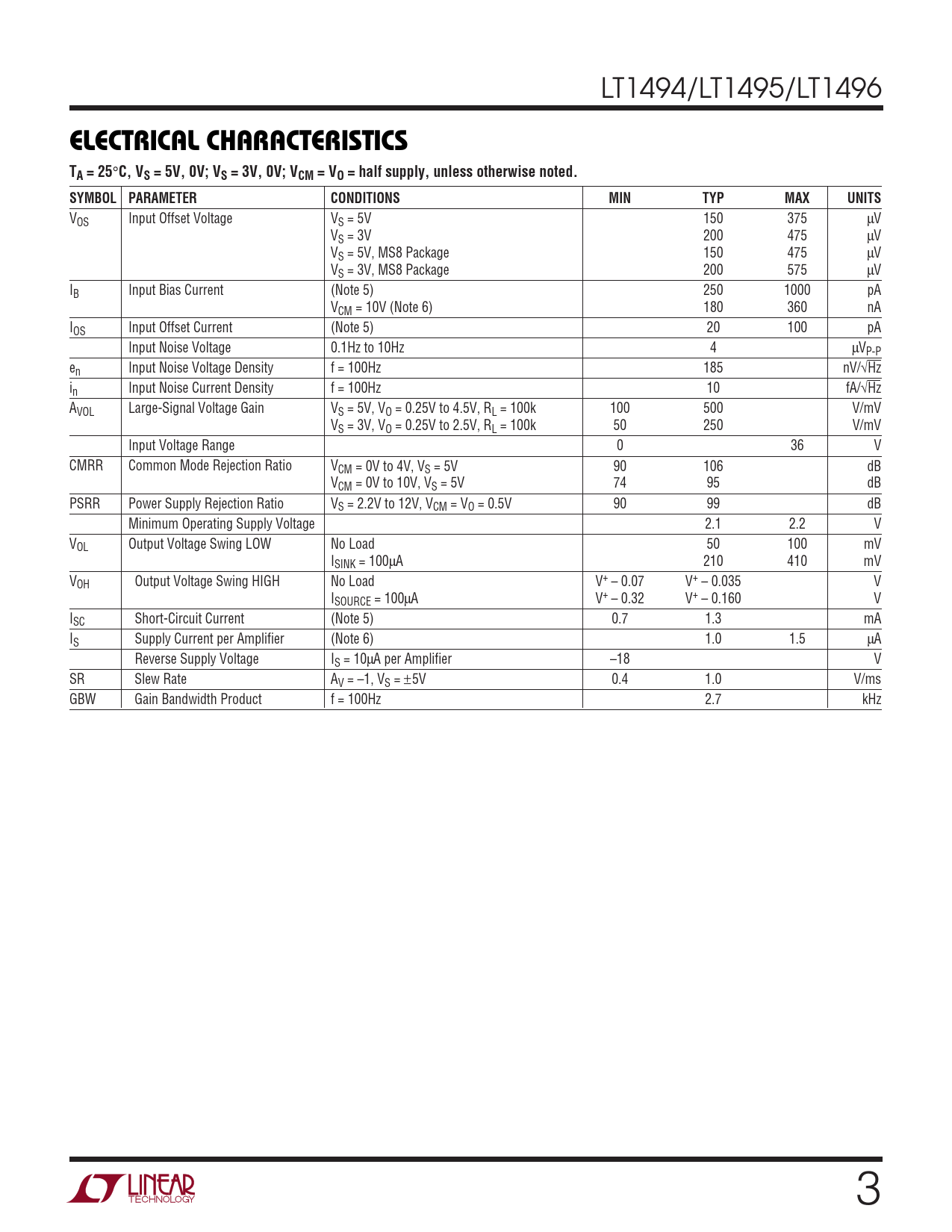 LT1494/LT1495/LT1496 ELECTRICAL CHARACTERISTICS TA = 25 ° C, VS = 5V, 0V; VS = 3V, 0V; VCM = VO = half supply, unless otherwise noted.SYMBOL PARAMETERCONDITIONSMINTYPMAXUNITS VOS Input Offset Voltage VS = 5V 150 375 µV VS = 3V 200 475 µV VS = 5V, MS8 Package 150 475 µV VS = 3V, MS8 Package 200 575 µV IB Input Bias Current (Note 5) 250 1000 pA VCM = 10V (Note 6) 180 360 nA IOS Input Offset Current (Note 5) 20 100 pA Input Noise Voltage 0.1Hz to 10Hz 4 µVP-P en Input Noise Voltage Density f = 100Hz 185 nV/√Hz in Input Noise Current Density f = 100Hz 10 fA/√Hz AVOL Large-Signal Voltage Gain VS = 5V, VO = 0.25V to 4.5V, RL = 100k 100 500 V/mV VS = 3V, VO = 0.25V to 2.5V, RL = 100k 50 250 V/mV Input Voltage Range 0 36 V CMRR Common Mode Rejection Ratio VCM = 0V to 4V, VS = 5V 90 106 dB VCM = 0V to 10V, VS = 5V 74 95 dB PSRR Power Supply Rejection Ratio VS = 2.2V to 12V, VCM = VO = 0.5V 90 99 dB Minimum Operating Supply Voltage 2.1 2.2 V VOL Output Voltage Swing LOW No Load 50 100 mV ISINK = 100µA 210 410 mV VOH Output Voltage Swing HIGH No Load V+ – 0.07 V+ – 0.035 V ISOURCE = 100µA V+ – 0.32 V+ – 0.160 V ISC Short-Circuit Current (Note 5) 0.7 1.3 mA IS Supply Current per Amplifier (Note 6) 1.0 1.5 µA Reverse Supply Voltage IS = 10µA per Amplifier –18 V SR Slew Rate AV = –1, VS = ±5V 0.4 1.0 V/ms GBW Gain Bandwidth Product f = 100Hz 2.7 kHz 3