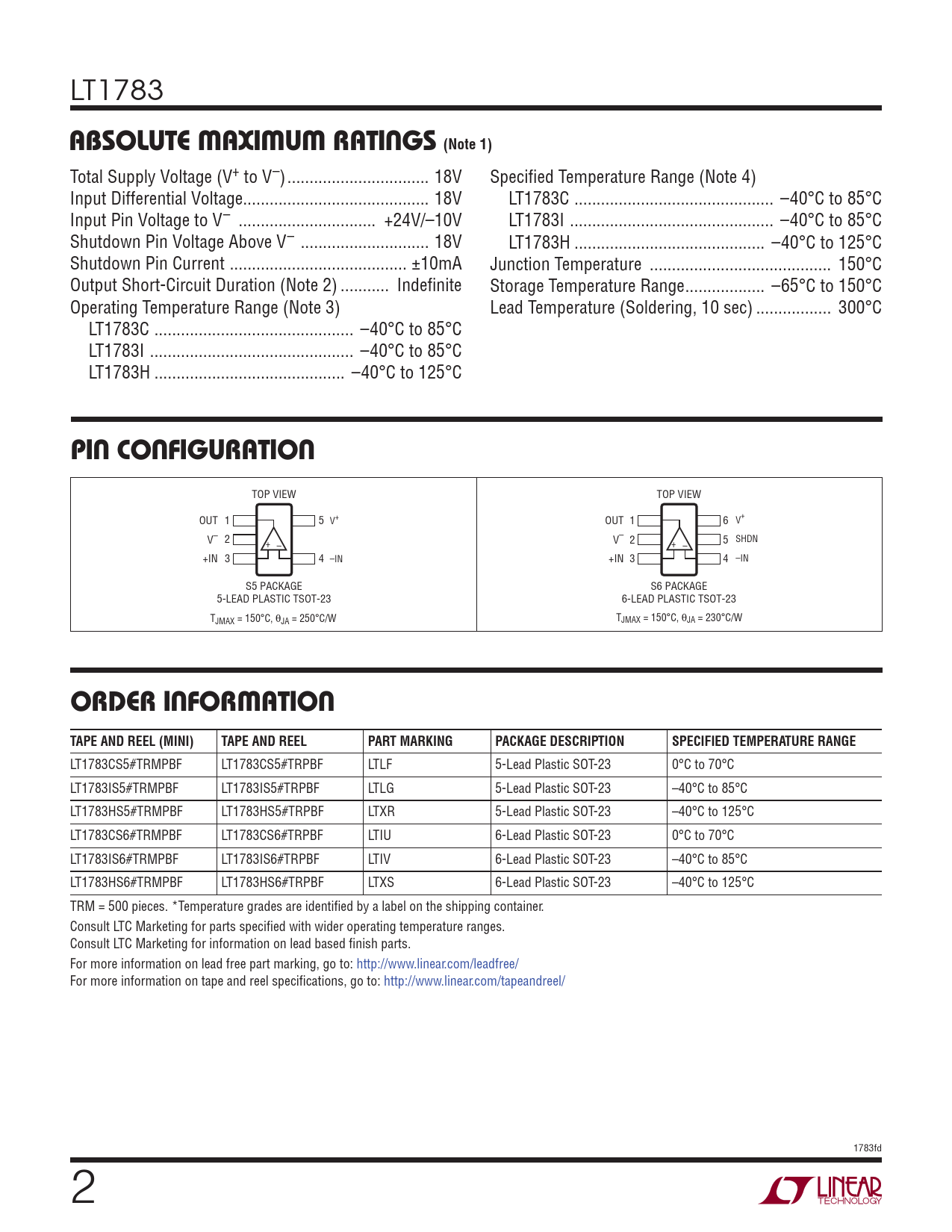 LT1783 ABSOLUTE MAXIMUM RATINGS (Note 1) Total Supply Voltage (V+ to V–) .. 18V Specifi ed Temperature Range (Note 4) Input Differential Voltage.. 18V LT1783C ... –40°C to 85°C Input Pin Voltage to V– ... +24V/–10V LT1783I .. –40°C to 85°C Shutdown Pin Voltage Above V– ... 18V LT1783H ... –40°C to 125°C Shutdown Pin Current .. ±10mA Junction Temperature ... 150°C Output Short-Circuit Duration (Note 2) ... Indefi nite Storage Temperature Range .. –65°C to 150°C Operating Temperature Range (Note 3) Lead Temperature (Soldering, 10 sec) ... 300°C LT1783C ... –40°C to 85°C LT1783I .. –40°C to 85°C LT1783H ... –40°C to 125°C PIN CONFIGURATION TOP VIEW TOP VIEW OUT 1 5 V+ OUT 1 6 V+ V– 2 V– 2 5 SHDN + – + – +IN 3 4 –IN +IN 3 4 –IN S5 PACKAGE S6 PACKAGE 5-LEAD PLASTIC TSOT-23 6-LEAD PLASTIC TSOT-23 TJMAX = 150°C, θJA = 250°C/W TJMAX = 150°C, θJA = 230°C/W ORDER INFORMATIONTAPE AND REEL (MINI)TAPE AND REELPART MARKINGPACKAGE DESCRIPTIONSPECIFIED TEMPERATURE RANGE LT1783CS5#TRMPBF LT1783CS5#TRPBF LTLF 5-Lead Plastic SOT-23 0°C to 70°C LT1783IS5#TRMPBF LT1783IS5#TRPBF LTLG 5-Lead Plastic SOT-23 –40°C to 85°C LT1783HS5#TRMPBF LT1783HS5#TRPBF LTXR 5-Lead Plastic SOT-23 –40°C to 125°C LT1783CS6#TRMPBF LT1783CS6#TRPBF LTIU 6-Lead Plastic SOT-23 0°C to 70°C LT1783IS6#TRMPBF LT1783IS6#TRPBF LTIV 6-Lead Plastic SOT-23 –40°C to 85°C LT1783HS6#TRMPBF LT1783HS6#TRPBF LTXS 6-Lead Plastic SOT-23 –40°C to 125°C TRM = 500 pieces. *Temperature grades are identifi ed by a label on the shipping container. Consult LTC Marketing for parts specifi ed with wider operating temperature ranges. Consult LTC Marketing for information on lead based fi nish parts. For more information on lead free part marking, go to: http://www.linear.com/leadfree/ For more information on tape and reel specifi cations, go to: http://www.linear.com/tapeandreel/ 1783fd 2